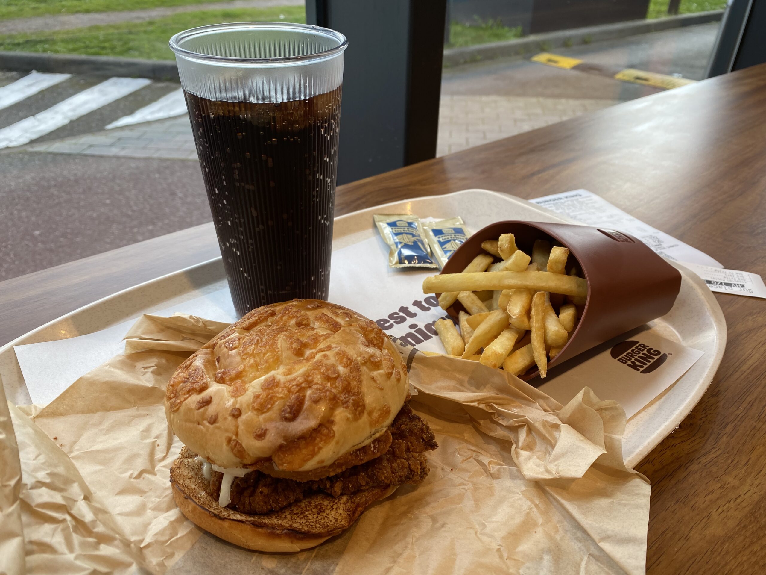 À l’intérieur un filet de poulet enrobé d’une panure croustillante est accompagné d’une galette d’emmental râpé, de bacon fumé, d’une sauce crémeuse à l’oignon, mais aussi d’oignons fondants. Le tout forme un assemblage gourmand et nourrissant, même si l’on reste clairement dans l’univers du fast-food. Au premier croc, le mélange rappelle brièvement la tarte flambée, ce qui est sûrement l’effet recherché. Avec ses près de 1000 calories, le burger cale bien, mais ne s’impose pas comme la révélation de l’année. Le tarif quant à lui, une quinzaine d’euros pour le burger, une portion de frites et une boisson peut sembler un peu élevé pour ce type de produit.