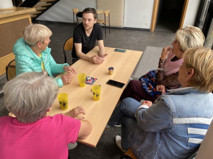 Grâce à l’aide de l’administratrice de la MAC, Cathy Kapfer, derrière le bar, Alexandre prend le temps de s’asseoir à la table de quatre dames. Jacqueline, Nicole, Solange et Marie-T se définissent comme « trois amies, plus une amie ». Elles papotent du film et de leur planning de retraitées : « Le mardi matin, on marche, l’après-midi on est nazes.