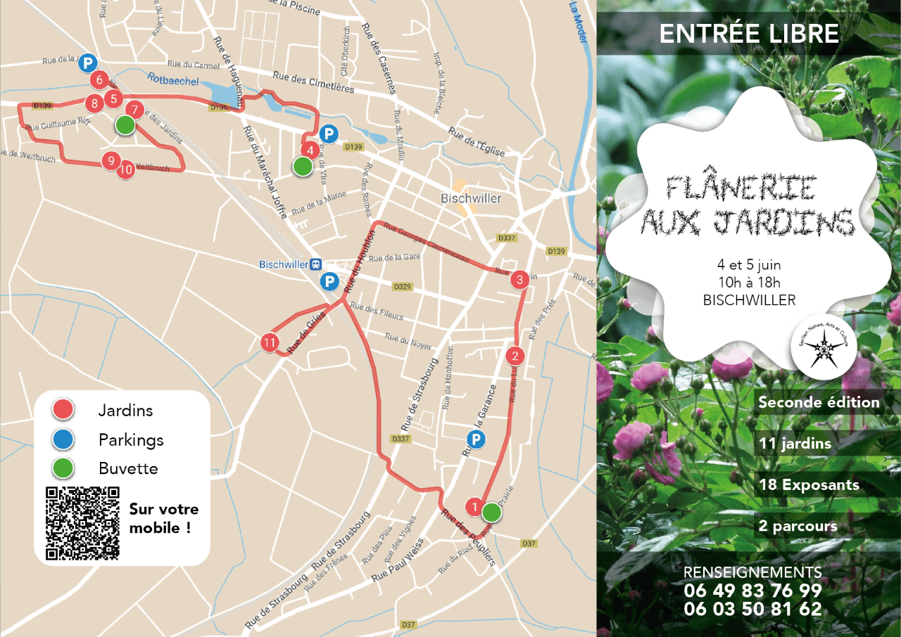 L’année dernière, les Flâneries aux jardins ont rassemblé sept jardins, contre onze cette année. « Dans chaque jardin, il y aura un – voire deux – exposants, comme un fleuriste, un mosaïste, un céramiste, un photographe et même des décorateurs. Ils seront dix-huit et contribueront à embellir les propriétés de chacun », complète Marie-Pierre. Le parcours de la précédente édition faisait dix kilomètres. Cette année, deux parcours ont été tracés: « Sur 1,5 kilomètre, il y aura jusqu’à cinq jardins à visiter, par exemple ». Les deux jours, les parkings à proximité seront indiqués. « Dans l’idée, les visiteurs pourront faire le parcours n°1 à pied, récupérer leur voiture et la poser sur un parking proche du parcours n°2 », conclut-elle. Des buvettes seront disposées à mi-chemin. Depuis un mois, les Flâneries aux jardins de Bischwiller font partie d’une section complémentaire du FCJAB appelée « Nature, art et culture ». Tous les profits de cette seconde édition iront au foyer.