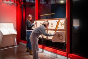Sur 500 m2, le parcours plonge petits et grands dans les coulisses d’un savoir-faire emblématique. Cartes à lever, parchemin à dérouler, tiroirs à explorer… les dispositifs ludo-pédagogiques se multiplient pour une visite qui se vit avec les mains autant qu’avec les yeux. En toile de fond, la vidéoprojection vient remplacer les écrans pour une immersion plus douce et évocatrice.