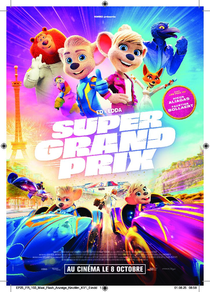 Le film d’animation SUPER GRAND PRIX, avec Ed & Edda dans les rôles principaux, fait la place belle à la vitesse et l’émotion. À l’affiche des cinémas, le long métrage viendra ravir les spectateurs avec des personnages charmants, une histoire captivante, de l’action et de l’humour. Pour interpréter les présentateurs de la course, le film réunit un casting exceptionnel et adoré par le public français ! Nikos Aliagas joue un commentateur déjanté et Faustine Bollaert une directrice de course espiègle. Des rôles que les deux personnalités ont pris énormément de plaisir à doubler. La bande son captivante du film est l’œuvre du compositeur allemand oscarisé Volker Bertelmann.