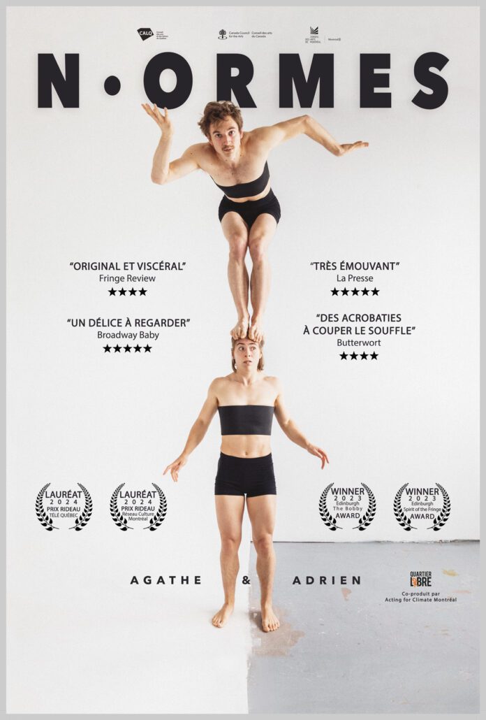 La Castine de Reichshoffen vous invite à découvrir le très beau spectacle N.Ormes, un duo de cirque contemporain (Cie Agathe et Adrien) tout droit venu du Québec le samedi 22 novembre à 20h. Diplômé de l’École de cirque de Québec en 2018, le duo Agathe et Adrien travaille et mêle les codes du cirque, de la danse contemporaine et de l’art performatif afin de créer un langage acrobatique riche et complexe. Provocante, dysfonctionnelle et tendre, cette pièce amène le spectateur à remettre en question ses propres a priori. Elle met en scène deux protagonistes et leur relation naviguant entre complicité et lutte de pouvoir. Alliant habilement main à main, jeux icariens et danse, la scène devient une arène. Peu à peu, les archétypes tombent au combat, laissant place à une quête d’amitié, d’équité, en puissance et en fluidité. A partir de 5 ans / Durée : 1h. Tarif normal 18€, Tarif réduit 15€, Tarif mini 8€, Tarif abonné 13€.