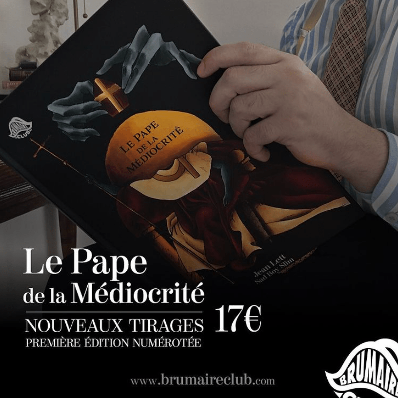 Le Pape de la Médiocrité — dont le tome 2 devrait bientôt sortir — est le fruit d’une collaboration complète entre l’écrivain et l’illustrateur. Le premier à la trame, le second à la communication, à la production et à la mise en page (colorisation, maquette). Prochaine sortie prévue : une pièce de théâtre illustrée, toujours sur le même thème. Si vous souhaitez vous procurer l’un des derniers numéros du premier tome, rendez-vous sur www.brumaireclub.com.