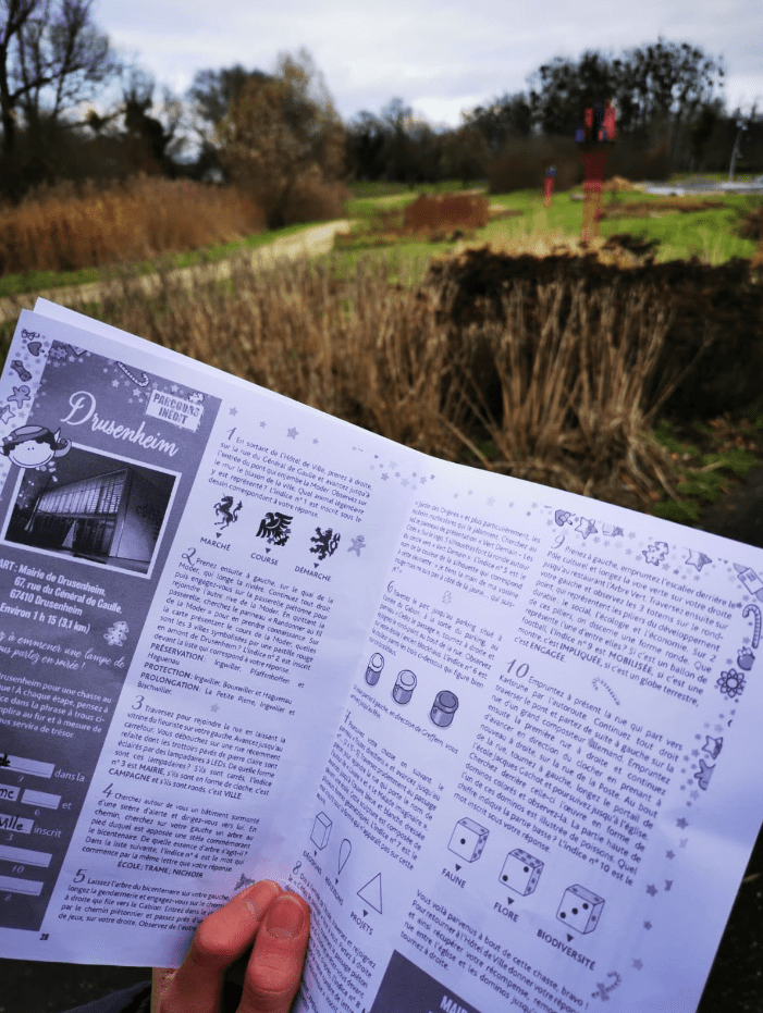 Munis du petit livret disponible à la mairie de Drusenheim et en téléchargement, Neven et son papa s’apprêtent à arpenter les rues du village pour remplir la phrase à trous, clé du trésor : « En sortant de l’Hôtel de Ville, prenez à droite sur la rue du général de Gaulle et avancez jusqu’à l’entrée du pont qui enjambe la Moder. Quel animal légendaire y est représenté ? » Si la réponse saute aux yeux, c’est parce qu’ « on est très bien guidés, c’est complet, selon Neven. Et en plus, ça nous fait une visite de Drusenheim où les illuminations de Noël sont belles et les habitants ont aussi décoré leurs maisons ».
