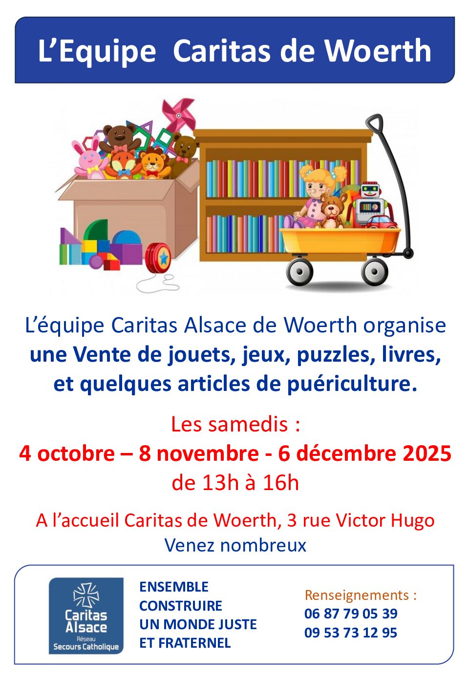 L'équipe Caritas Woerth organise le samedi 08 novembre de 13h à 16h une vente de jouets, jeux, puzzles, livres et quelques articles de puériculture dans ses locaux au 3 Rue
