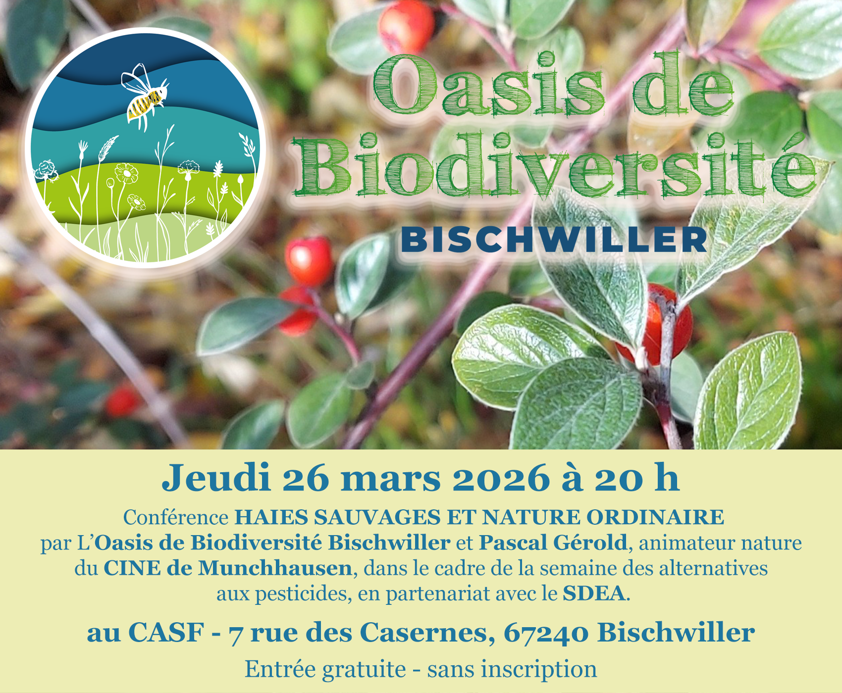 Dans le cadre de la semaine des alternatives aux pesticides, en partenariat avec le SDEA l'oasis de biodiversité Bischwiller proposera une conférence sur la thématique des haies sauvages, animée