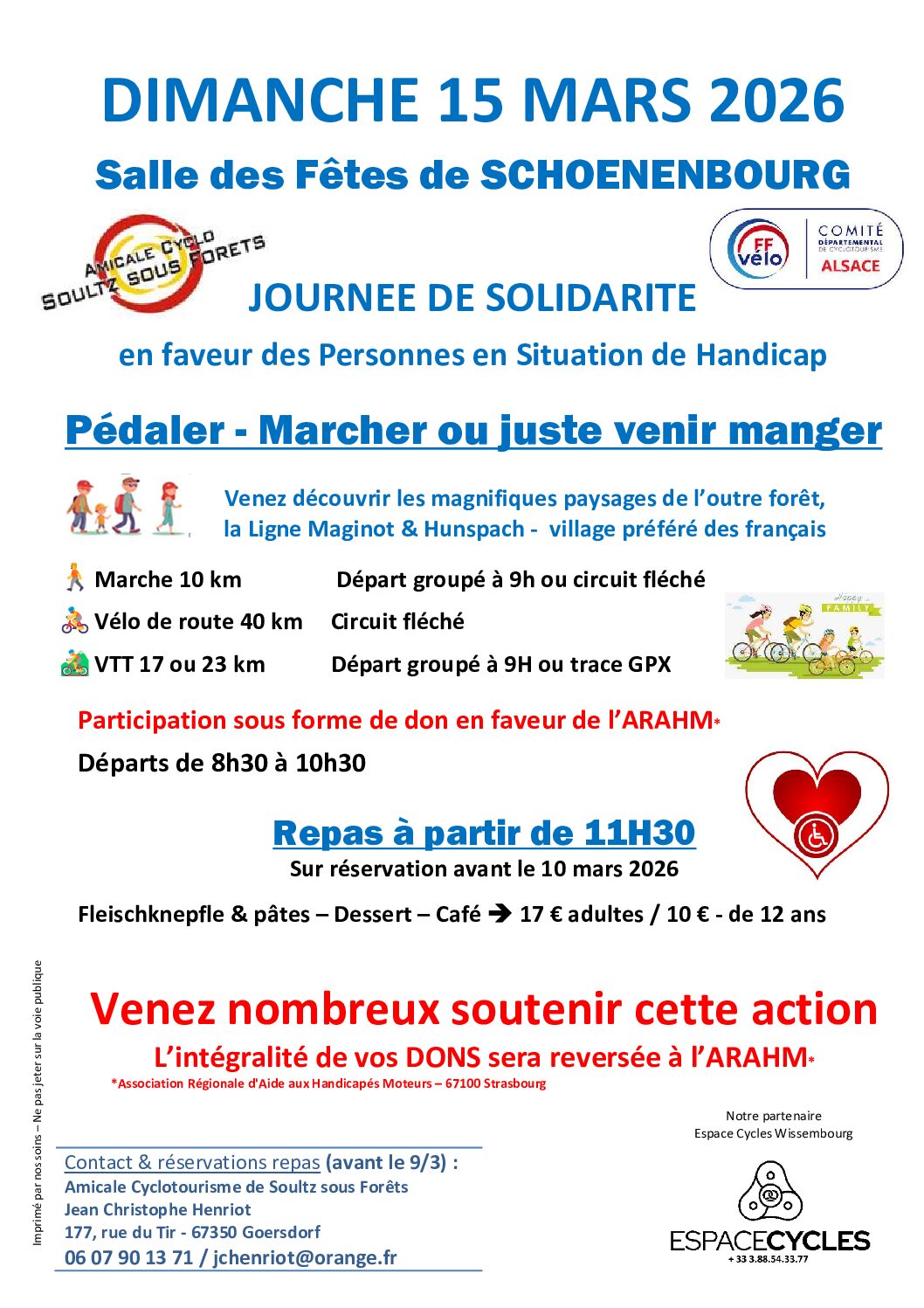L’Amicale Cyclotouriste de Soultz-Sous-Forêts organise une journée avec plusieurs circuits de randonnée le dimanche 16 mars à Schœnenbourg à la salle des fêtes. Il y aura un circuit marche de 10 km, un circuit vélo route de 40 km et un circuit VTT/Gravel de 17 ou 25 km. Départ de 8h30 à 10h. Un repas sera également proposé à midi (fleischknepfle, pâtes, dessert et café hors boissons à 17€/adulte et 10€/enfant jusqu’à 12 ans) sur réservation avant le 9 mars. Il s’agit d’une manifestation afin de recueillir des fonds en faveur des personnes handicapés. L’intégralité des bénéfices sont reversés à notre comité Alsace qui recueille les dossiers de différentes organisations ou de familles.