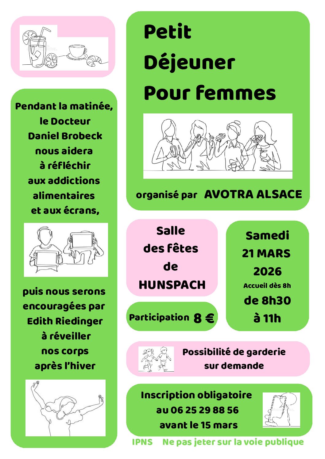 L'Association AVOTRA ALSACE vous invite à un Petit Déjeuner pour Femmes le samedi 21 mars à 8 H 30 à la salle des fêtes de Hunspach. Après le petit déjeuner,