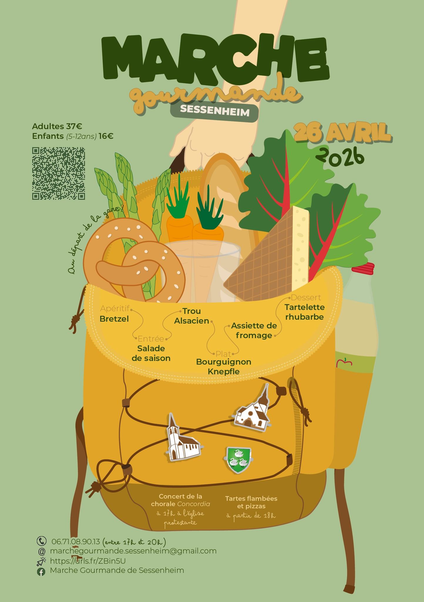 La marche gourmande, organisée par un ensemble d’associations de Sessenheim, aura lieu le dimanche 26 avril 2026. Une marche en 6 étapes sur 10 km, départs au périscolaire toutes les 20 minutes à partir de 10h. Au menu des étapes : apéritif avec bretzel / salade de saison / trou alsacien / bourguignon avec knepfle / assiette de fromages, tartelette à la rhubarbe. Tarif 37€/adulte, 16€/enfant (5 à 12 ans). Concert de la Chorale Concordia à 17h à l’église protestante. Tartes flambées et pizzas à partir de 18h.
