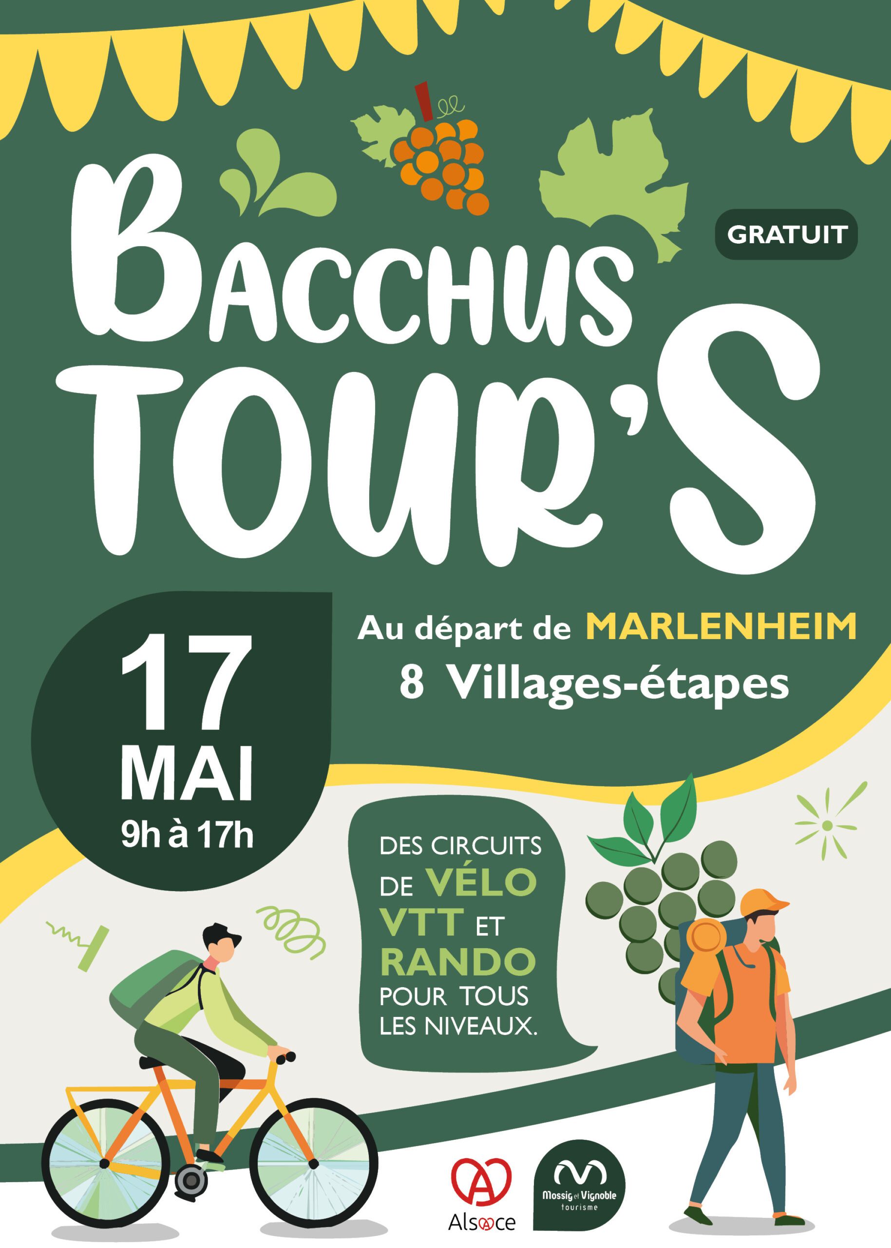 L’Office de Tourisme Mossig et Vignoble est ravi de vous donner rendez-vous le dimanche 17 mai, de 9h à 17h (et jusqu’à 19h à Marlenheim), pour la quatrième édition de son événement devenu incontournable dans la région : le Bacchus Tours ! Au départ de Marlenheim, partez à l’aventure à vélo, en VTT ou en randonnée, sur des circuits balisés et adaptés à tous les niveaux et profitez des magnifiques paysages au cœur du vignoble alsacien. Tout au long des parcours, il sera possible de faire escale dans les 8 villages-étapes qui accueillent une place festive pour profiter d’une ambiance conviviale et festive avec des concerts, de la restauration et de nombreuses animations. L’événement est 100 % gratuit et sans inscription.