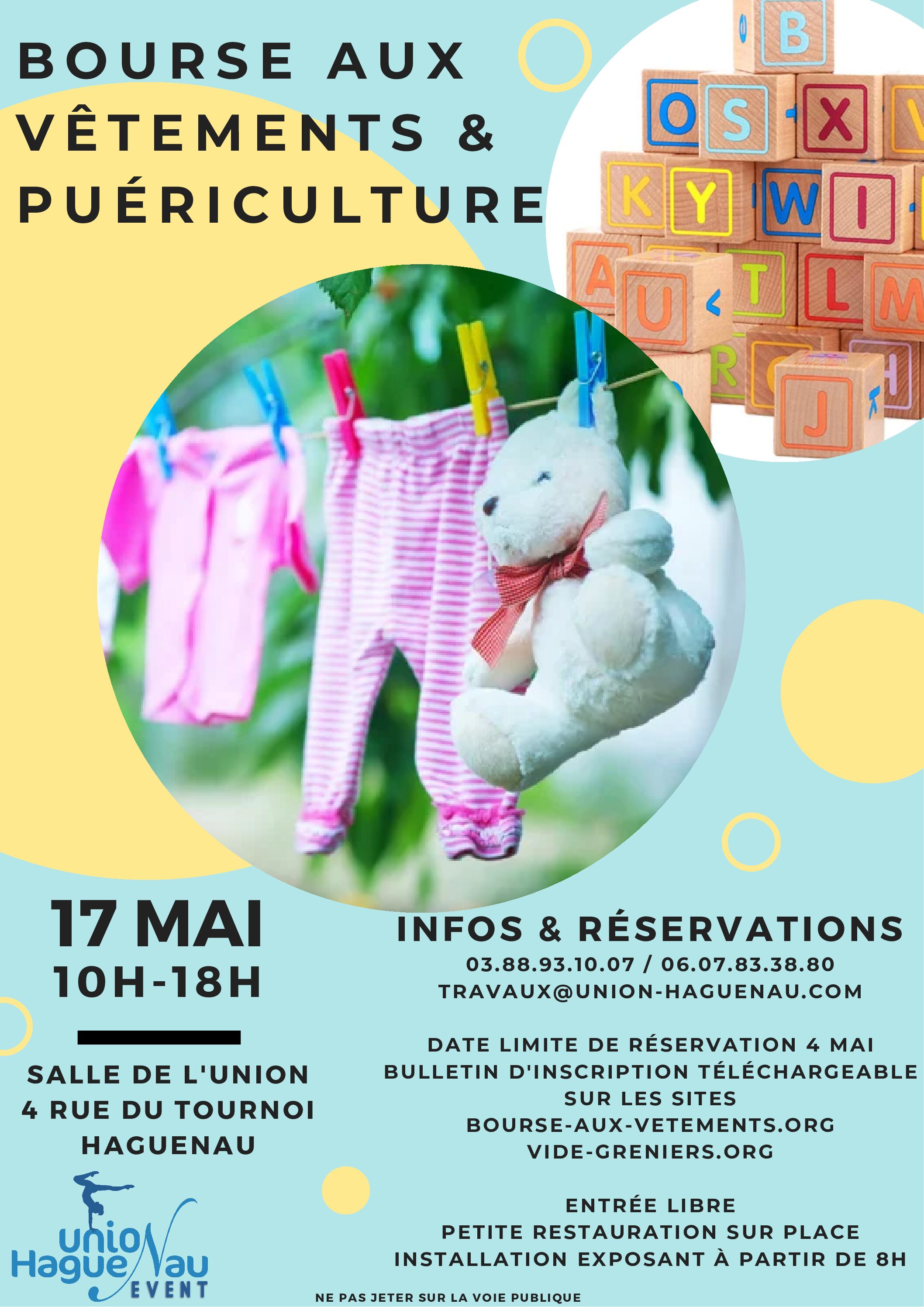 La Société de Gymnastique et de Sports UNION HAGUENAU organise le 17 mai 2026 une bourse de vêtements et de matériel de puériculture dans ses locaux au 4 rue du Tournoi à Haguenau. Entrée libre et petite restauration. Accueil visiteurs de 10h à 18h . Tarif exposant 12€ la place + portant non fourni 2€. Vous trouverez le bulletin d’inscription exposants sur le site bourse bourse-aux-vetements.org ; paiement et inscription possibles en ligne.