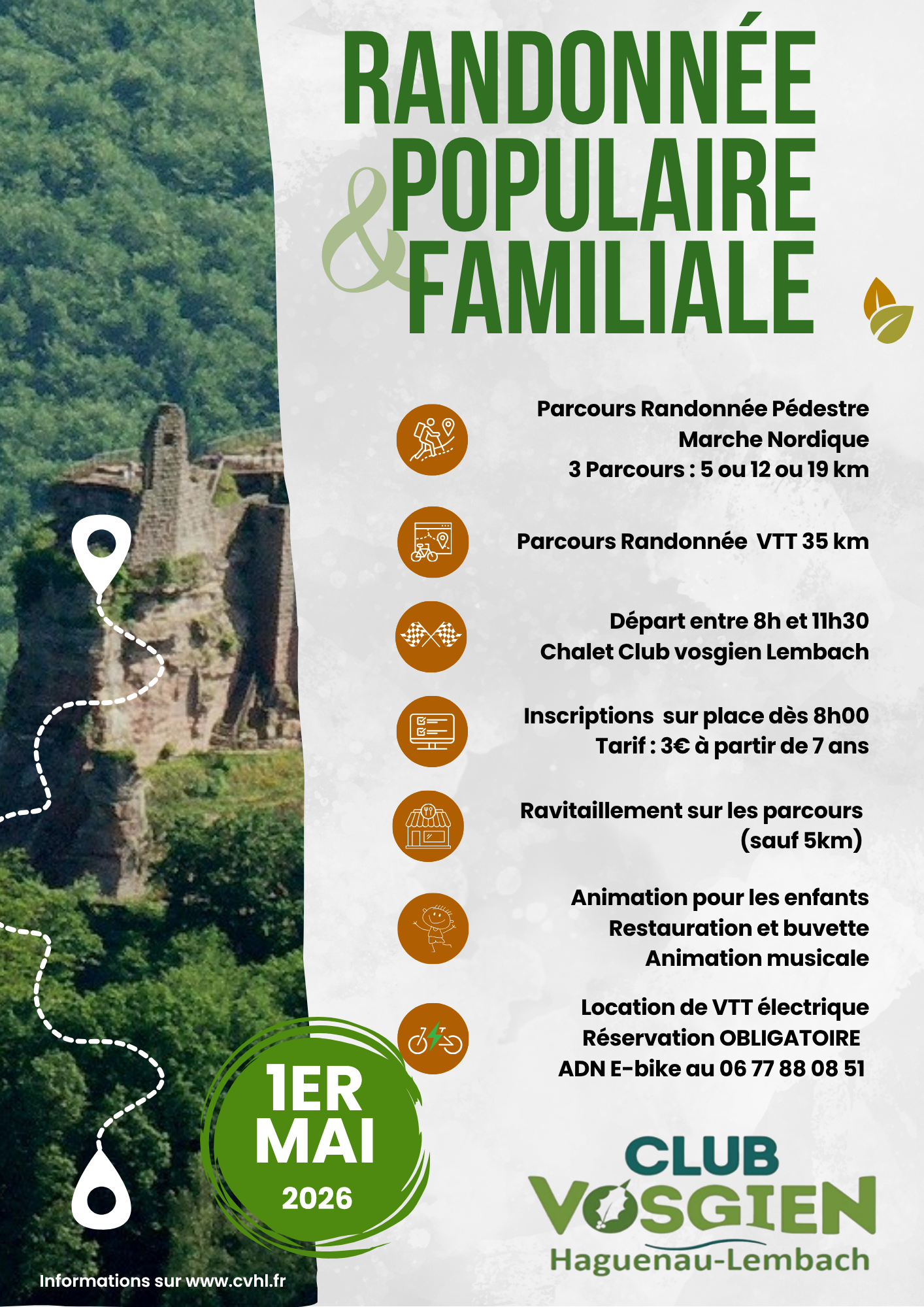 Le Club Vosgien Haguenau-Lembach vous attend le 1er mai au Chalet de Lembach. Au programme : parcours pédestres (5, 12 ou 19 km) et VTT (35 km), animations pour
