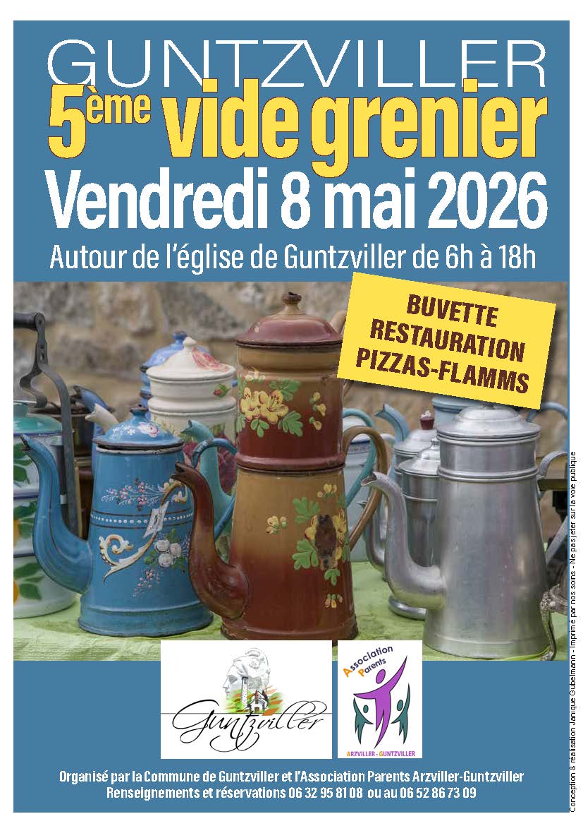 La Commune de Guntzviller et l’Association Parents Arzviller-Guntzviller vous donnent rendez-vous le vendredi 8 mai 2026 autour de l’église de Guntzviller pour une journée conviviale et pleine de bonnes affaires