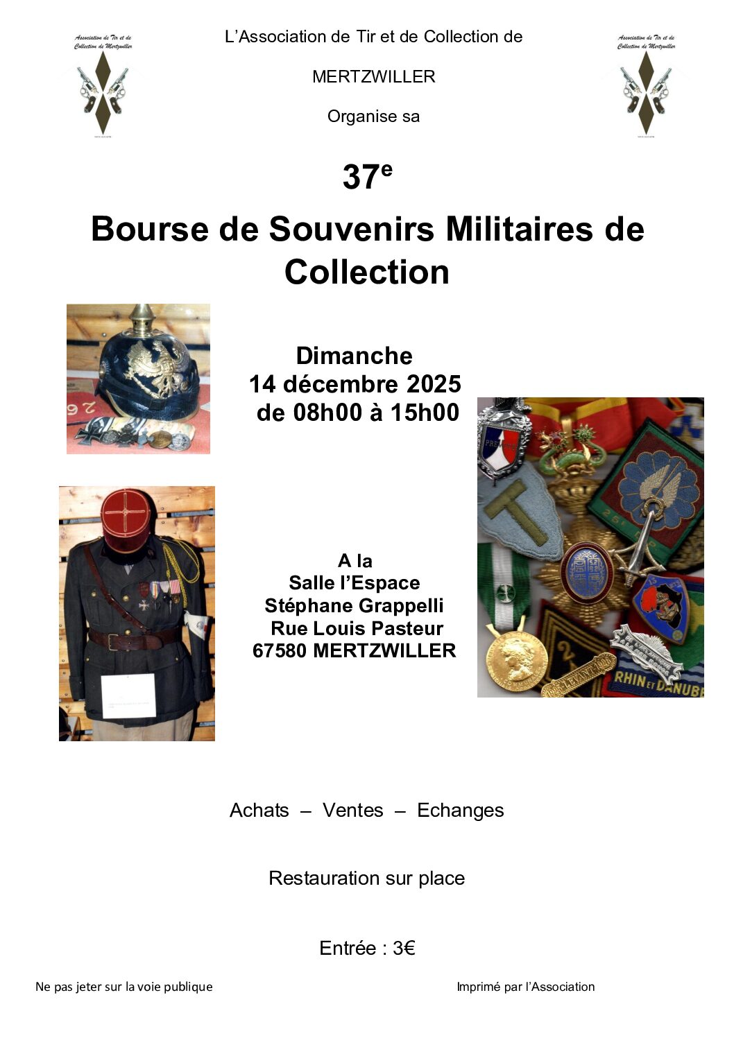 L’Association de Tir et de Collection organise son 37e salon aux souvenirs militaires de collection, qui aura lieu à l’Espace Grappelli de Mertzwiller le 14 décembre de 08h à