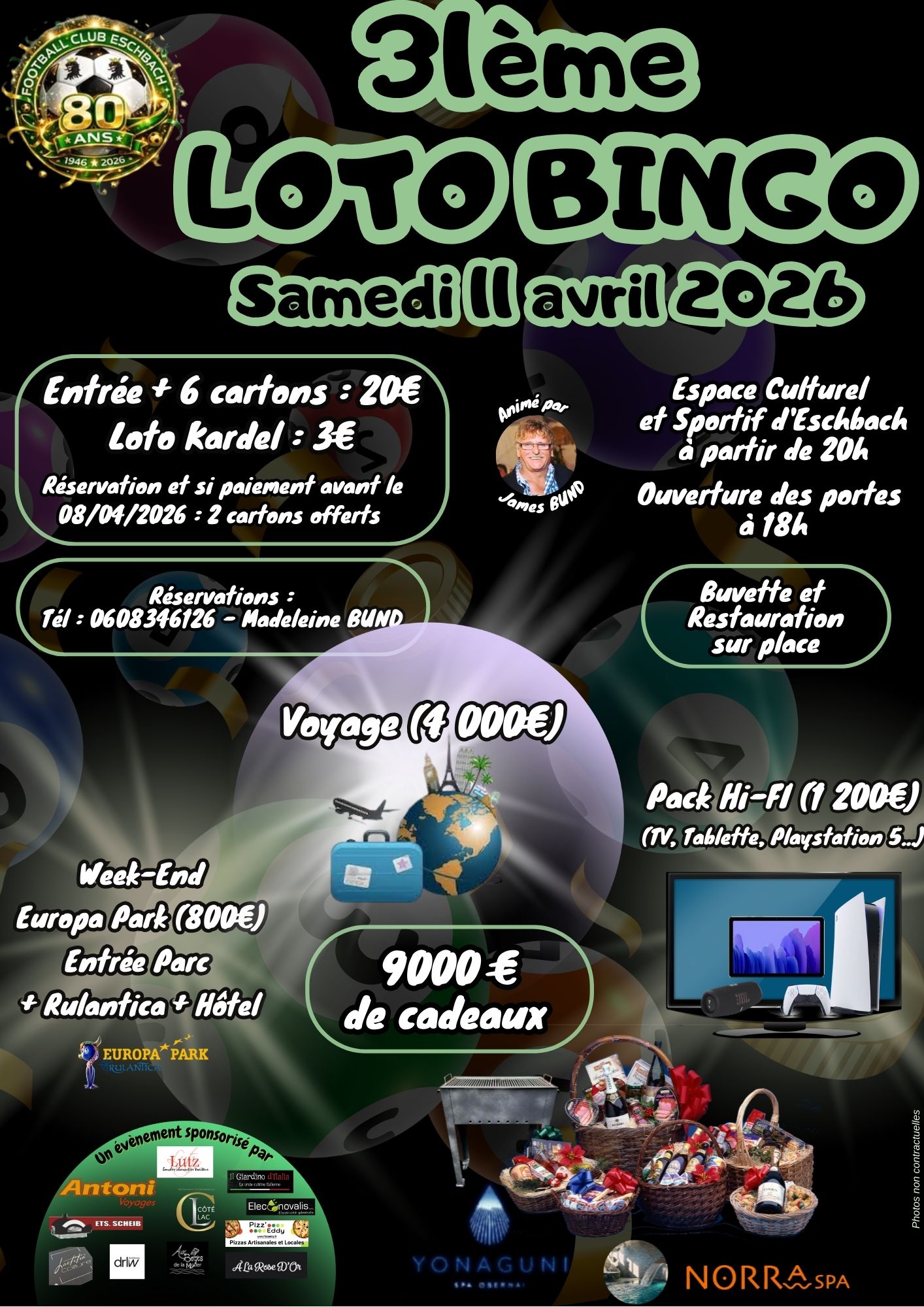 Le football club Eschbach organise son 31ème loto bingo le samedi 11 avril à l'espace culturel et sportif d'Eschbach à partir de 20h. Ouverture des portes à 18h. Buvette