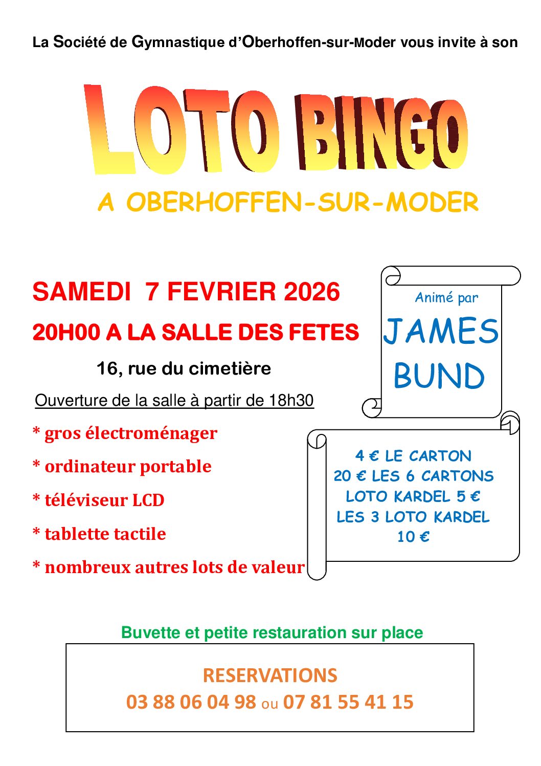 La Société de Gymnastique de Oberhoffen-sur-Moder vous invite à son loto bingo le samedi 7 février à 20h à la salle des fêtes (16 rue du Cimetière). Animation par James Bund. Ouverture de la
