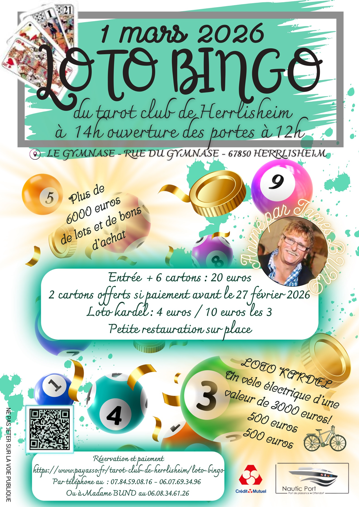 Le Tarot Club de Herrlisheim vous invite le dimanche 1 mars à 14h à son loto bingo animé par James Bund au gymnase de Herrlisheim. Plus de 6 000€