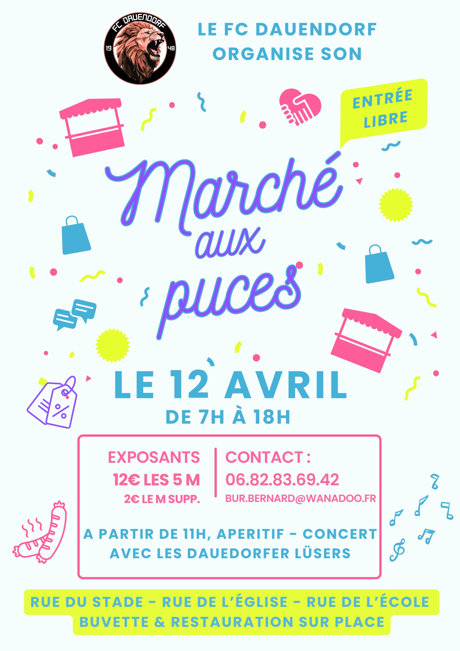 Le FC Dauendorf organise son marché aux puces le dimanche 12 avril rue du Stade, rue de l'Eglise, rue de l'Ecole. Buvette et restauration sur place. Tarif exposant :