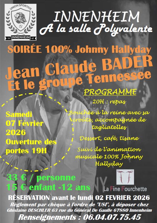 L’Union Sportive d’Innenheim organise une soirée 100% Johnny Halliday par Jean Claude Bader et le groupe Tennessee le samedi 7 février à la salle polyvalente d’Innenheim. Ouverture des portes