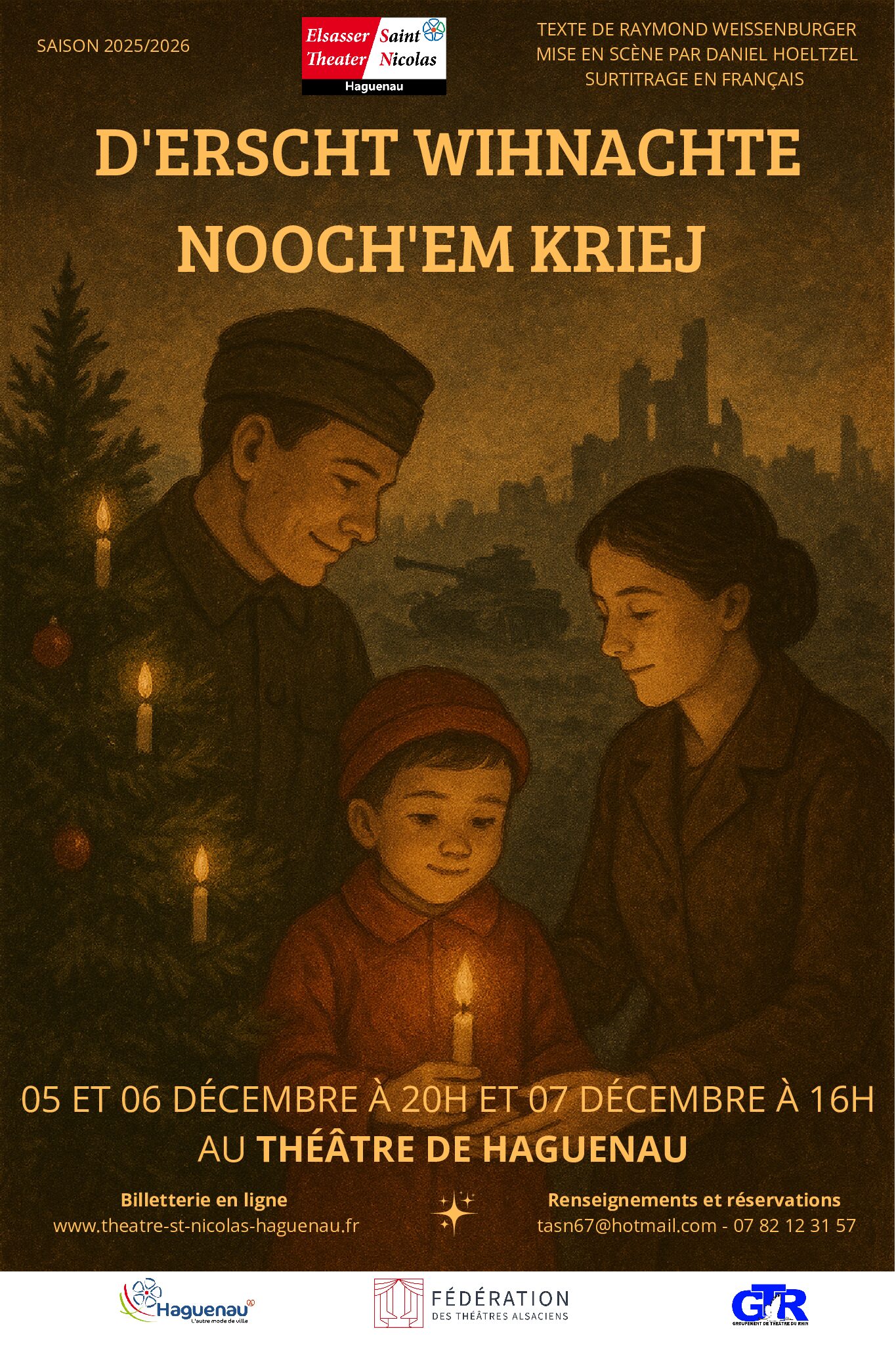 Le théâtre Saint Nicolas vous invite à découvrir sa prochaine pièce “D’ERSCHT WIHNACHTE NOOCH’EM KRIEJ” les 05 et 06 décembre à 20h et le 07 décembre à 16h au Théâtre de Haguenau. Billetterie en ligne sur theatre-st-nicolas-haguenau.fr.