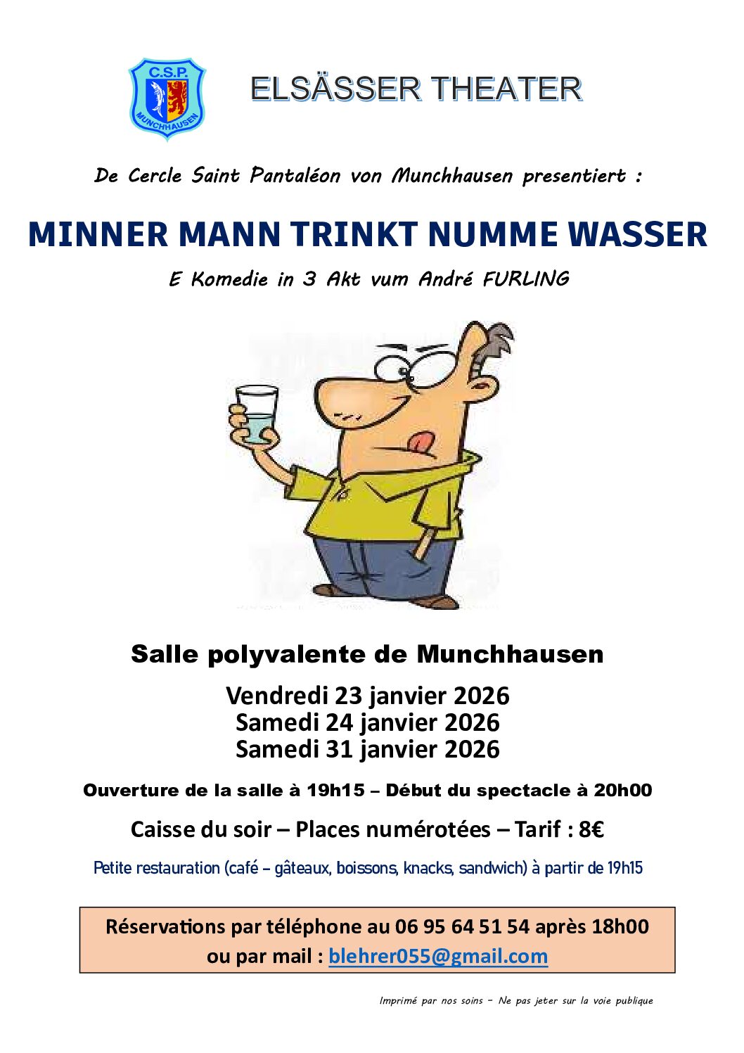 Le cercle Saint Pantaléon de Munchhausen vous présente la comédie "Minner Mann trinkt numme Wasser " une pièce en trois actes de André Furling les vendredi 23, samedi 24 et samedi