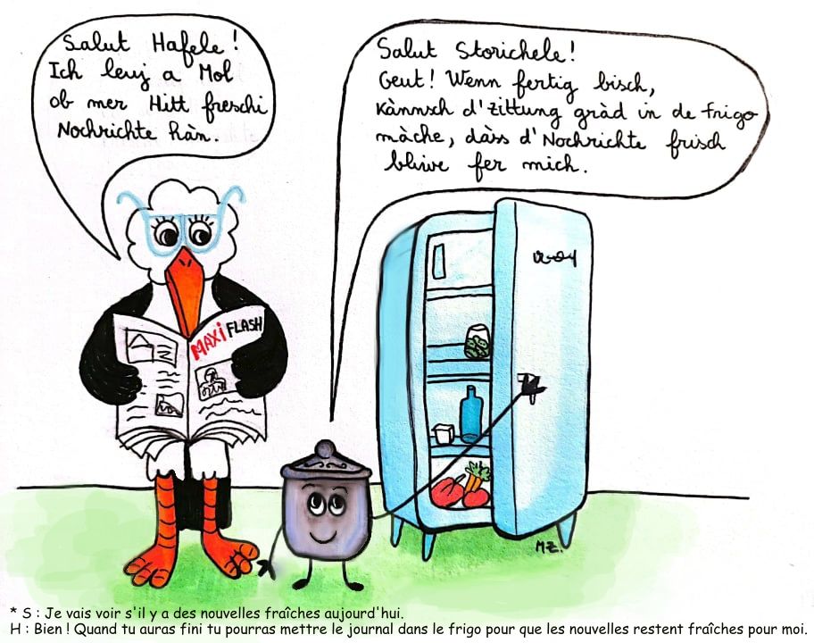 Lorsque Manon Zinck Dambach entre à l’école maternelle de Gundershoffen, elle ne parle qu’alsacien. C’est peut-être pour cela que les langues l’ont toujours intéressée. Elle est devenue professeure des écoles en classe bilingue et l’année de son arrivée à l’école de Betschdorf, elle invente Hafele et Storichele (un petit pot et une cigogne) : ils seront les mascottes pour sa classe et ne la quitteront plus. Ils apparaissent sous forme de marionnettes ou en dessin, car son crayon danse depuis toute petite ; ses professeurs ont souvent gardé des souvenirs de ses années de scolarité.