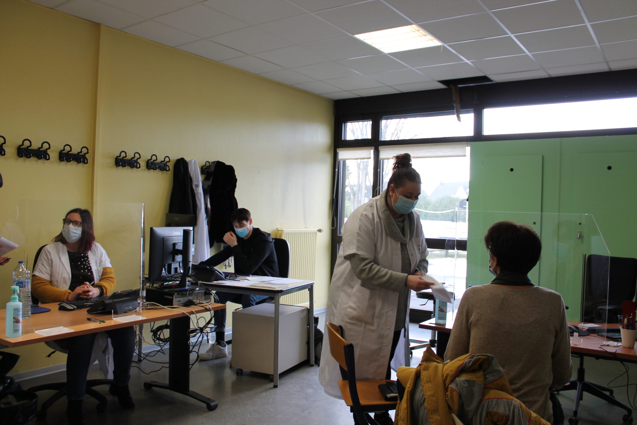 Il est 14h30. A première vue, pas d’agitation dans les locaux, mais les trois standardistes sont submergés d’appels. A l’instar de Patrick. Habituellement employé au skatepark de Haguenau, il a été dépêché pour s’occuper du standard. “C’est beaucoup de coups de fil, de changements de rendez-vous, mais on fait aussi des accueils en présentiel. C’est sûr que c’est différent de ce que je fais d’habitude”, explique-t-il. Reprogrammer les 300 rendez-vous qui étaient prévus les 25 et 26 janvier, accueillir la cinquantaine de personnes qui se présentent chaque jour pour essayer d’obtenir une date et gérer les centaines d’appels entrants, le standard ne chôme pas. “C’est speed, ça va vite, mais je m’en sors bien. Je me sens utile dans ce combat contre le Covid”, ajoute encore Patrick, satisfait. “C’est dynamique !”, clame l’une de ses collègues.