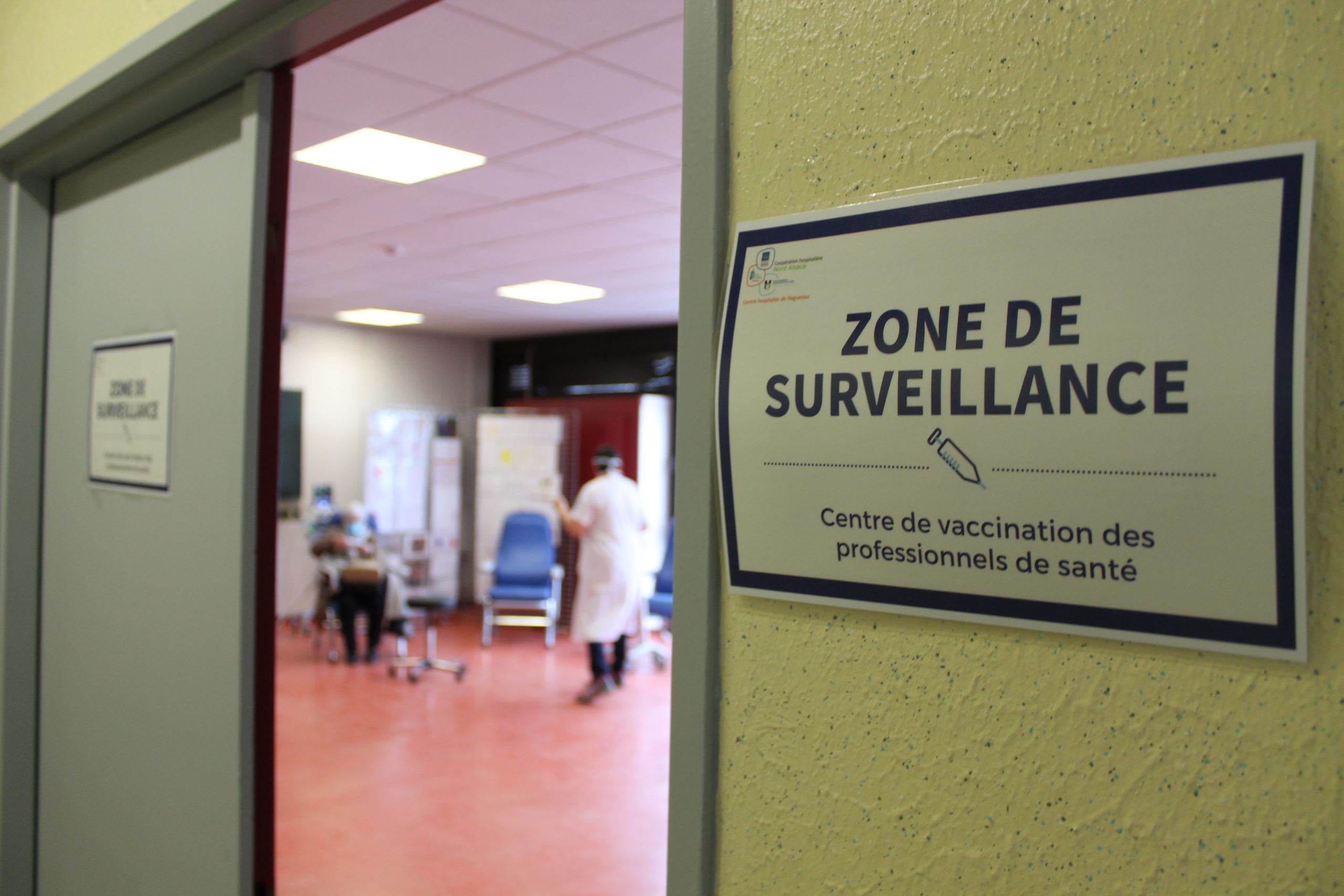 Le long couloir de l’ancien Institut de formation en soins infirmiers a été repensé pour la campagne de vaccination. Les bureaux vacants ont été réinvestis et aménagés pour chaque étape : passage obligatoire par le secrétariat pour s’enregistrer, par la salle d’attente pré-vaccination et par la salle d’observation post-vaccination pour garder sous surveillance les patients pendant une quinzaine de minutes avant leur sortie. “La vaccination prend cinq à sept minutes et le temps d’attente entre chaque étape est de moins de dix minutes”, indique Mathieu Rocher, directeur du Centre Hospitalier de Haguenau.