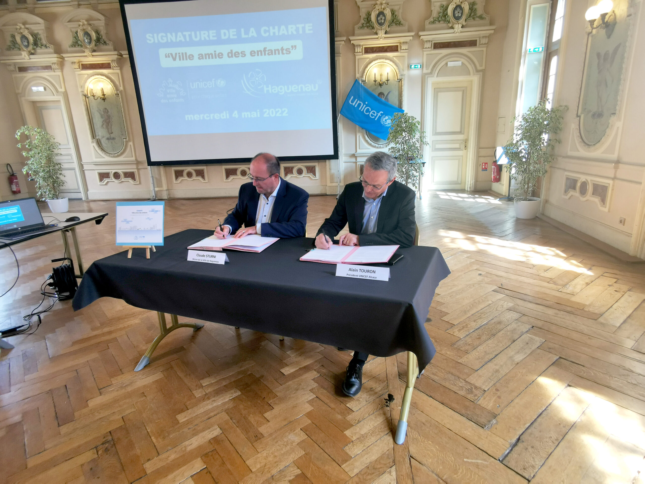 Pendant un an, « un dossier assez lourd qui demande de la collecte de données transversales, à base de chiffres, de statistiques et de documents, a été monté avant le grand oral avec l’Unicef », explique Élise Sonntag, chargée de communication. Si le titre a été décerné en novembre 2021, « il a fallu patienter pour la signature à cause des restrictions sanitaires ». Le maire Claude Sturni et le président d’Unicef Alsace, Alain Touron, ont ainsi paraphé la charte le 4 mai, entourés d’enfants des centres socio-culturels et du Conseil municipal des enfants (CME).