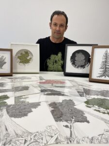 «L’attrape-nuages», «Photo de famille», les sakuras et les bouleaux, autant d’œuvres qui lui demandent plusieurs semaines de travail, assis à la lumière de son bureau. S’il commence par « des gribouillis pour se détendre et se vider l’esprit », il est parfois inspiré par « un arbousier dans le jardin d’amis » ou par une photo prise en forêt. L’artiste passe aussi du fond blanc et feutre noir à l’inverse, ou « habille l’arbre » de nuages, racines, pierres ou prairies. Prochain objectif : le tableau 3D, qu’il a déjà commencé à creuser.