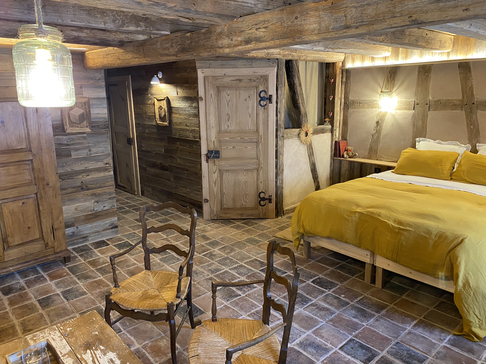 Le couple se lance alors dans une année et demie de « travaux acharnés » et récupère tout ce qu’il peut. Ici, les planches du séchoir à tabac, là les tomettes d’un hôpital de Molsheim ou encore une fenêtre de la Poste de Strasbourg, et pour le mobilier, une ancienne machine à coudre, un banc de Bierstub, un bummelhof mais aussi « un coffre polychromé du 18e siècle chiné 50€ à l’Esplanade, moins cher qu’à Ikea », plaisante Jacques.