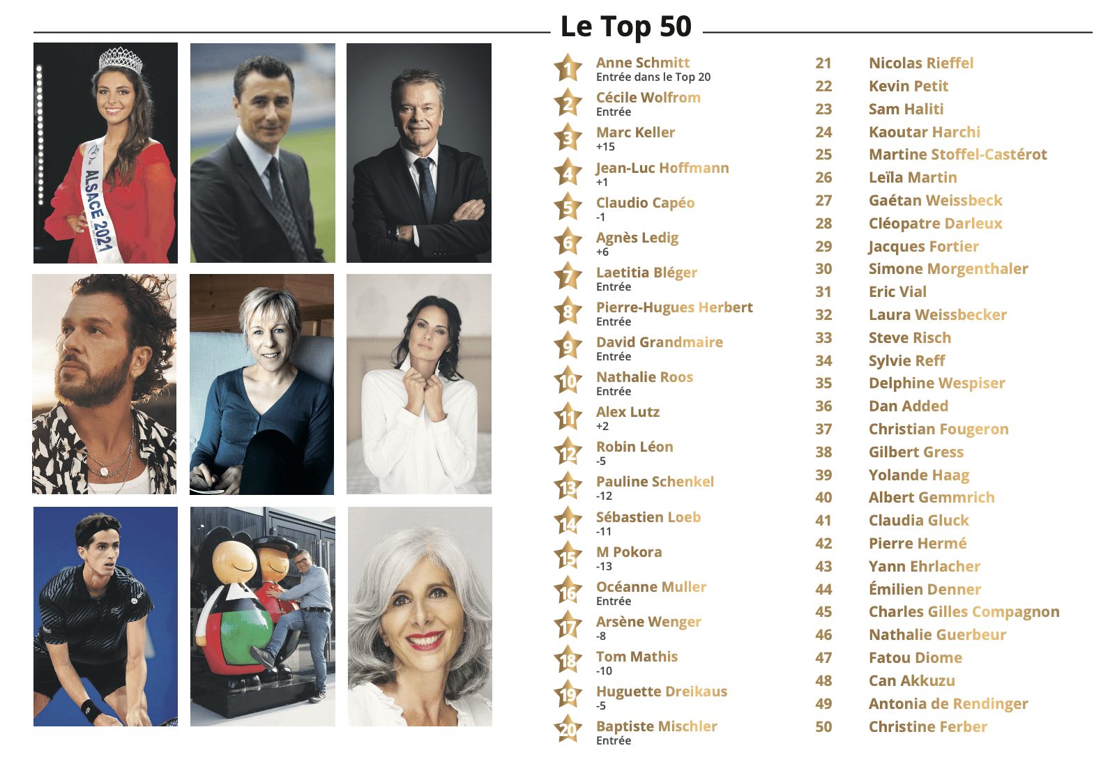 Alex Lutz fait + 2 (11e), Robin Léon, le petit prince du Schlager made in Alsace est 12e, Arsène Wenger est 17e et Tom Mathis avant une année qui s’annonce formidable pour ses 10 ans de carrière est 18e. Nicolas Rieffel, Kevin Petit, Sam Haliti l’Alsacien de Koh Lanta restent au pied du TOP 20 qui compte 8 femmes et 12 hommes (29/21 dans le TOP 50).