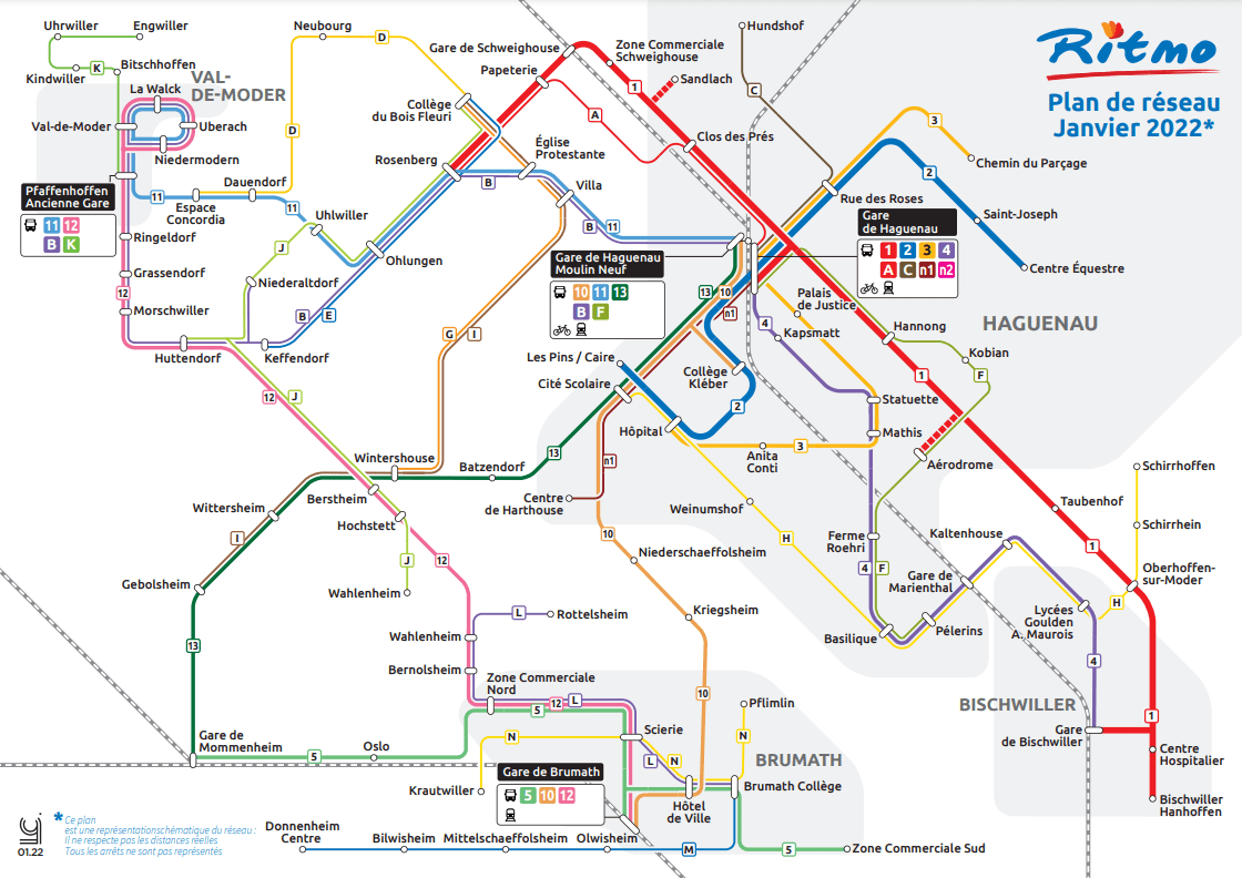 « Les lignes existantes sur Haguenau et Schweighouse ont été prolongées. Il y aura maintenant cinq lignes urbaines, quatre interurbaines et seize de renfort scolaire. Ces dernières seront ouvertes à tous lors de leur circulation le matin et le soir». La ligne 10 reliant Haguenau à Brumath, passant par Kriegsheim et Niederschaeffolsheim, sera renforcée. Elle deviendra une ligne régulière, tout comme la 11 entre Haguenau et Val-de-Moder, ou encore la 12 et la 13. « Aux heures de pointe, il y aura un bus toutes les demi-heures. Aux heures creuses et pendant les vacances scolaires, il y aura un bus par heure », détaille le vice-président. Les communes placées hors de ce réseau pourront bénéficier des transports à la demande Flexi’Ritmo. « Aujourd’hui, ils n’ont rien. Demain, ils auront une solution », conclut André Erbs.