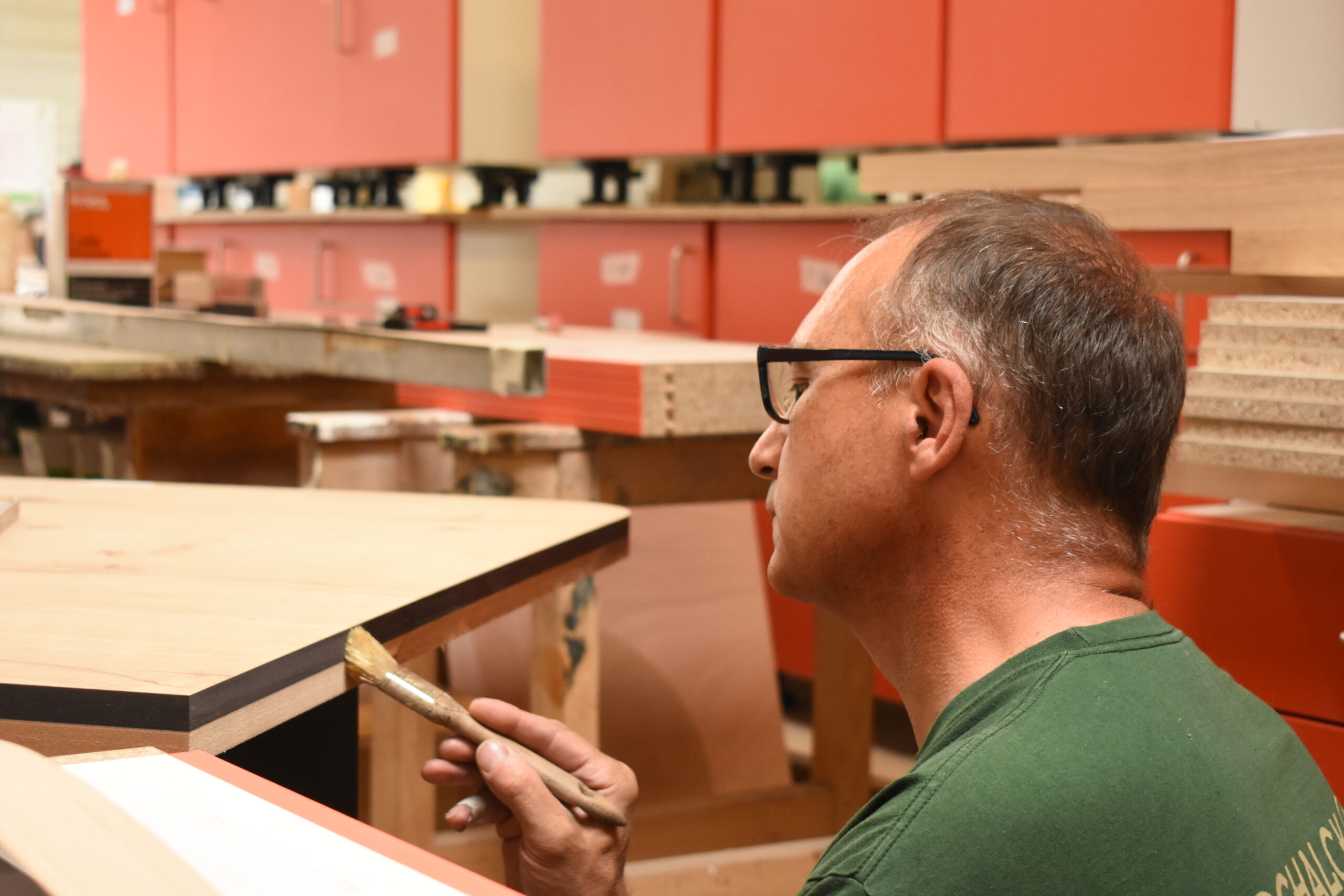 Dès que le dessinateur-projeteur m’amène les fiches de fabrication avec toutes les informations nécessaires. Je commande le matériel et j’organise le sillage des panneaux, l’encollage des chants, la partie commande numérique pour le perçage, et la partie assemblage/finition. Tous les menuisiers ont un rôle différent : agenceurs, ébénistes, etc. Une fois tout le travail terminé, ce sont les menuisiers de pose qui prennent le relais, et qui se rendent sur le chantier pour tout installer.