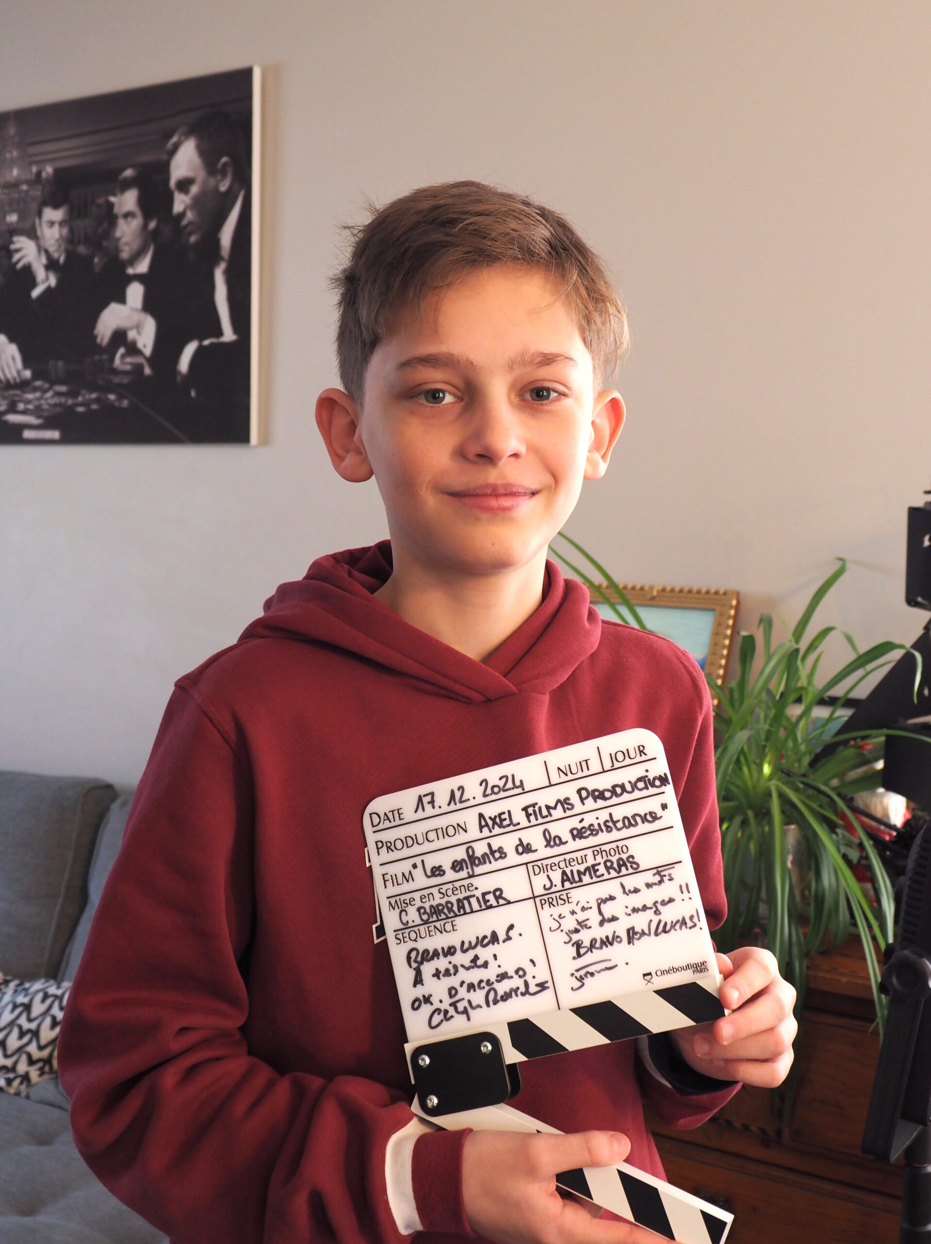 Oui, je vois beaucoup de films, de séries et des documentaires sur la réalisation ou des making of. J’avais surtout imaginé que ça serait sympa de réaliser des films. Je fais attention au placement de la caméra, je remarque parfois de faux raccords ou l’ombre de la caméra. Lorsque j’ai vu la première version de la bande-annonce des Enfants de la résistance, j’ai remarqué que des paraboles n’avaient pas été enlevées. À l’école de musique, j’ai fait du cor parce qu’il y en avait beaucoup dans les musiques de films, comme dans Star Wars, Gladiator, Avatar ou Le seigneur des anneaux. Réalisateur, ça a l’air mieux qu’acteur, parce qu’il contrôle, c’est sa vision du film. Quand je pense à mon premier film, je me dis que ça sera un western, genre Le Bon la Brute et le Truand ou Il était une fois dans l’Ouest.