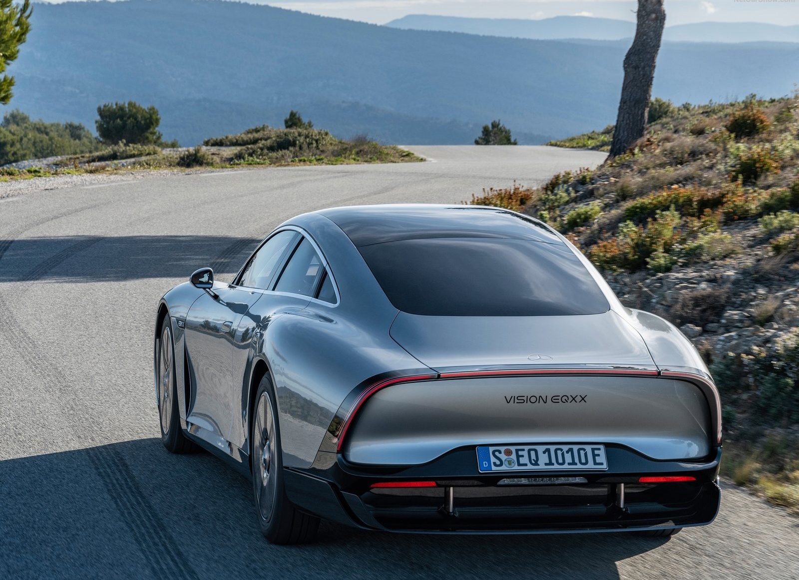 C’est donc sur l’aérodynamisme que les ingénieurs ont d’abord travaillé. Il en ressort une silhouette atypique, comme taillée par le dieu des vents Éole. C’est le coefficient de pénétration dans l’air (Cx) qui a commandé tous les choix esthétiques. Et le résultat est loin d’être désagréable à l’œil. Les lignes sont d’une grande fluidité et d’une extrême finesse. Il faudra toutefois se faire à cet arrière impressionnant, qui se termine comme une queue de paon. D’ici surgit, à partir de 60 km/h, un diffuseur rétractable. Avec un Cx de 0,17, l’EQXX est tout simplement l’automobile possédant le meilleur coefficient de traînée jamais produite! « Nous voulions dessiner la voiture la plus aérodynamique possible tout en respectant l’ADN de Mercedes, à savoir un design identifiable et de la sportivité » expliquait Teddy Woll, responsable de l’aérodynamique de l’EQXX, lors de la présentation du projet.