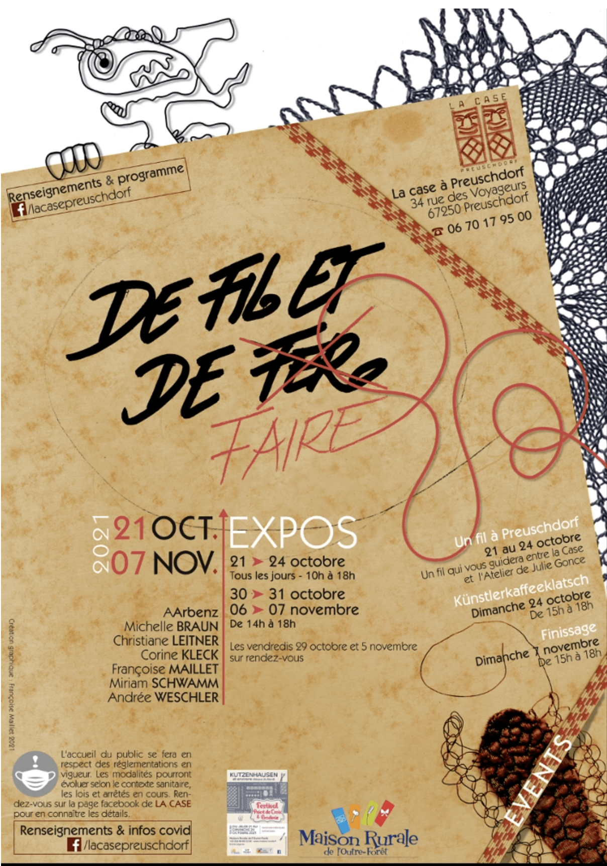 La collaboration n’a pas été forcément facile au début, car la Maison rurale a sa façon de fonctionner, et moi je voulais qu’à La Case cela se passe autrement. Je gère ma communication, j’essaye de faire venir du public pour les artistes qui se sont donné la peine de créer, au-delà des aficionados du point de croix ou de la broderie. Il y a des propositions assez féministes, des artistes comme Corine Kleck ou Françoise Maillet, des artistes qui touchent le textile pour en faire des œuvres. Andrée Weschler fait d’immenses colliers de perles en porcelaine. Et j’ai aussi deux nanas qui font du patchwork. Il y aura beaucoup de diversité, beaucoup de rencontres. Moi-même je propose une partie d’un travail que j’avais fait avec des dentelles et des soutiens-gorge et je ferai une œuvre de Street-art sur le mur extérieur.