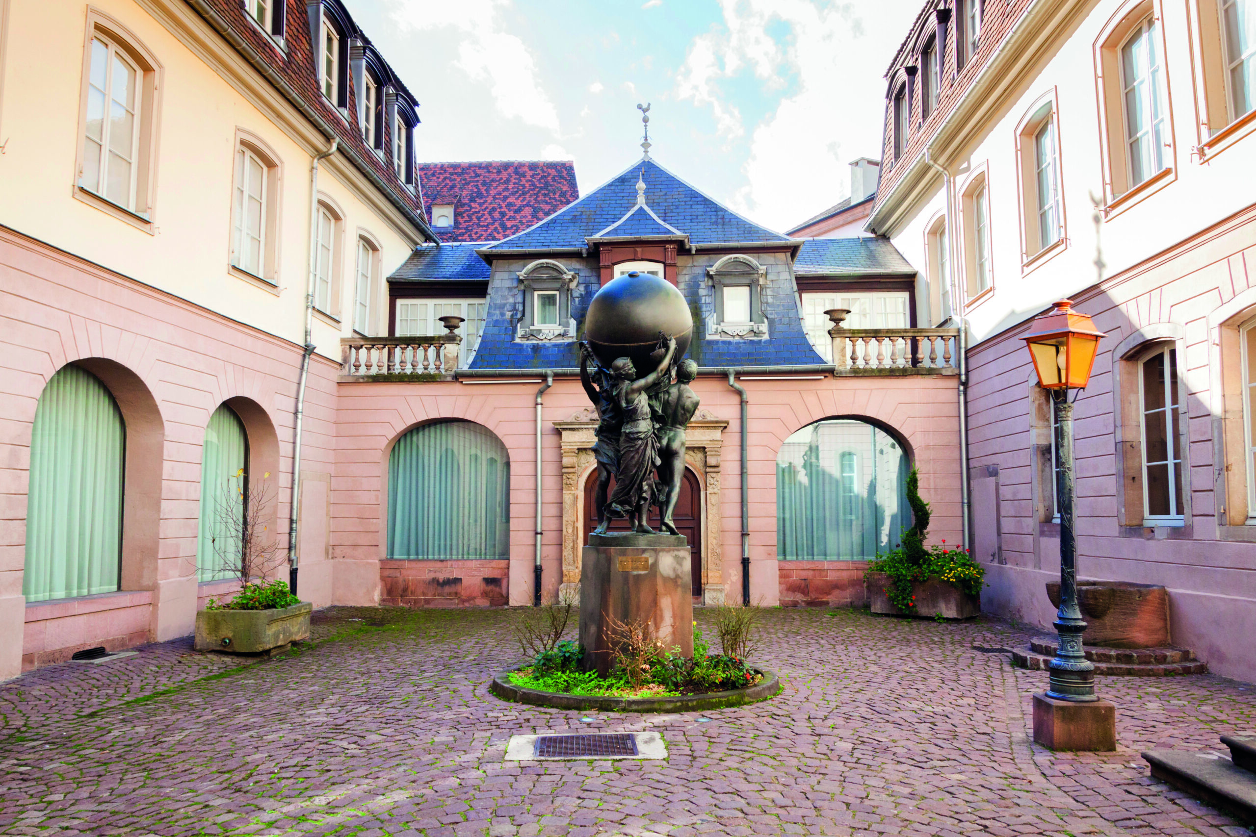 « Les Grands Soutiens du Monde » est une statue érigée par Auguste Bartholdi en 1902. Cet imposant ouvrage est installé dans la cour du Musée Bartholdi, au sein de la maison de l’artiste. Les trois personnages sculptés, qui soutiennent un globe terrestre, représentent le travail, le patriotisme et la justice. Du 28 avril au 14 mai, le musée et la Fondation du patrimoine prévoient sur place une restauration « en direct », ouverte aux visiteurs. L’œuvre subit des détériorations causées par le climat.