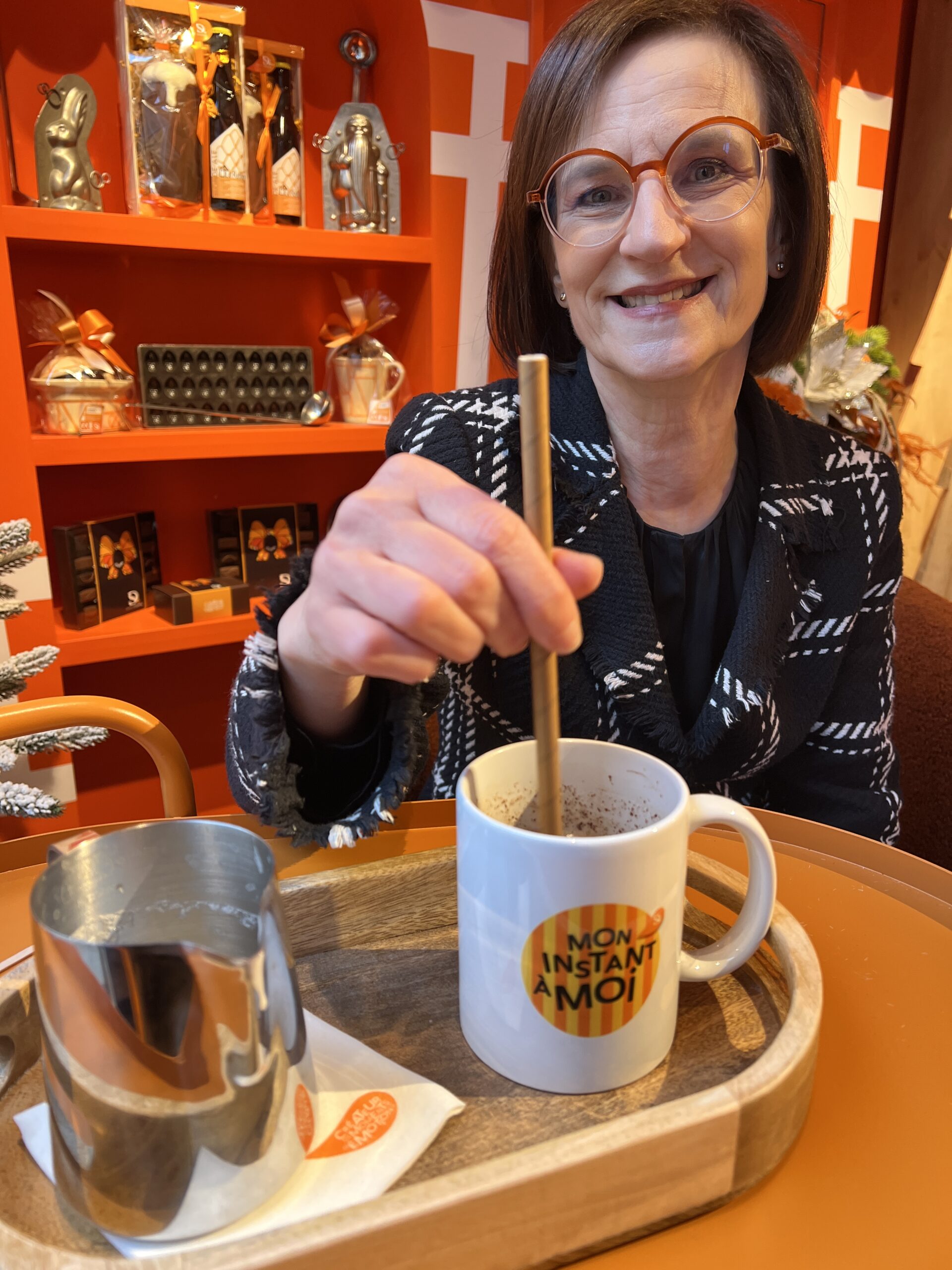 Martine me propose un chocolat chaud à partir d’une sphère conçue avec une fève de Colombie de la région de Tumaco, une pure origine fruitée agrumes, plus précisément pomelos et clémentine. En fin de bouche arrive un gout de café, c’est un chocolat à 70%. Là-dessus elle verse un lait d’amande, plus végétal et plus digeste. C’est la tendance qui plaît, l’amande va bien avec le chocolat. Mais cela peut se faire avec un lait de vache, c’est traditionnel, mais plus riche et cela apporte de l’onctuosité. C’est de saison et va si bien avec le Maennele et Saint-Nicolas qui arrive.