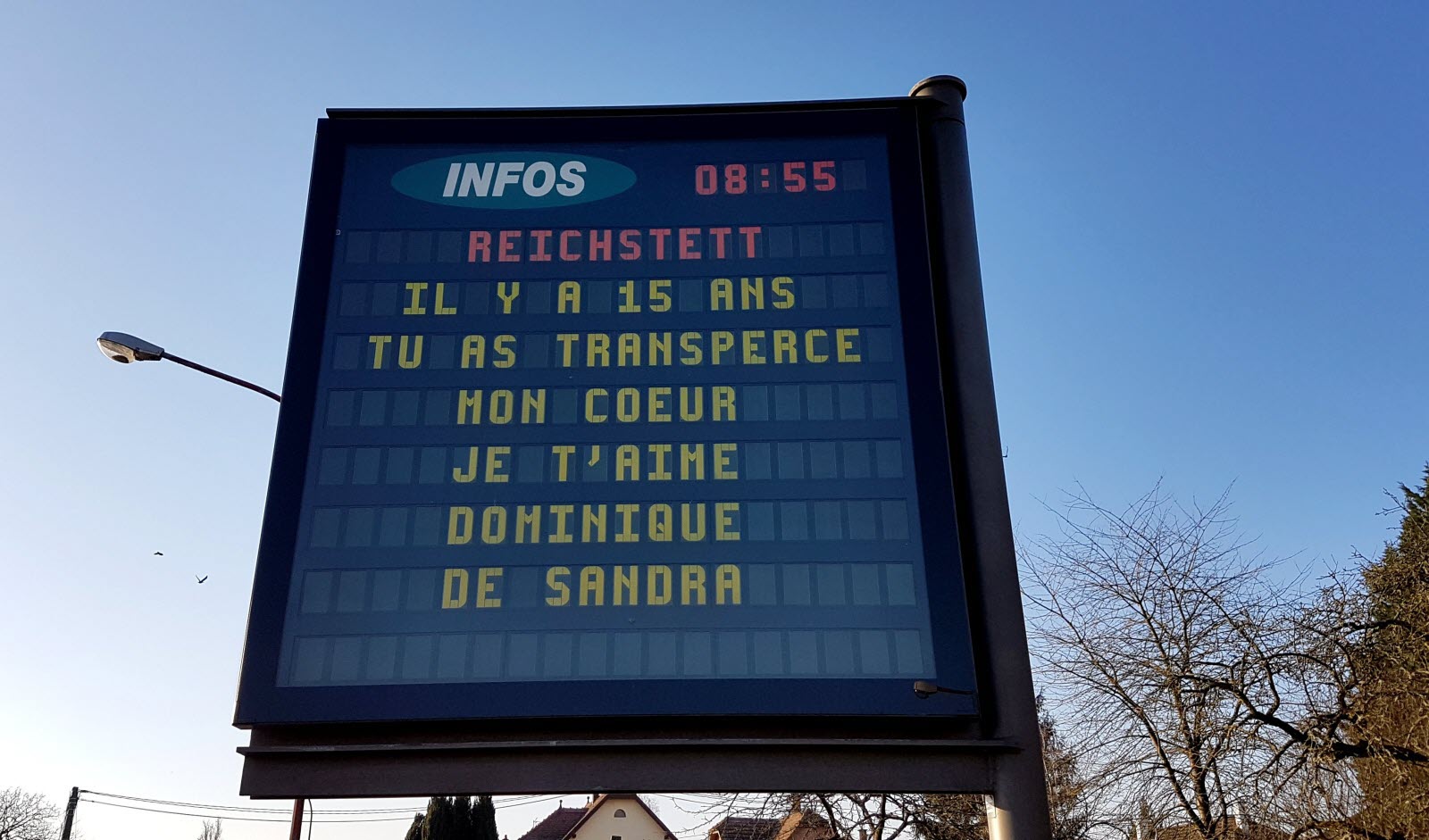 L’année dernière, la commune de Reichstett s’est dotée d’un écran lumineux haute définition, placé à l’entrée nord du village, en complément du panneau à messages variables à l’entrée sud. Pour la Saint-Valentin, la mairie donne la possibilité aux amoureux de déclarer leur flamme par vidéo ou par message textuel. Ils seront diffusés les 13 et 14 février. « Un montage des vidéos sera à retrouver sur notre site internet », complète Frédéric Huss, chargé de communication à la ville de Reichstett.