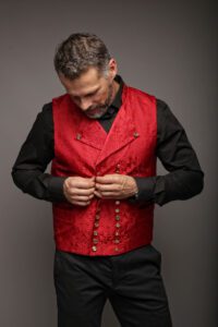J’avais Geht’s in en tête depuis longtemps, car ça m’embêtait de louer du Dirndl allemand pour une fête alsacienne ! (rires) Beaucoup de costumes traditionnels en Europe sont composés d’un corselet et d’une jupe attachée, ce sont les détails qui font la différence. J’ai supprimé le tablier mais gardé la découpe du dos, le laçage devant, réinterprété le plastron… Je remets des caractéristiques de la région pour que tout le monde s’y retrouve, le costume protestant avec sa jupe verte, le kelsch millénaire, l’étoffe de Noël de Mulhouse… Pour les hommes, le gilet alsacien avec la version unie Hopla, et le Schatzi qui est damassé. Tout le travail sur ces dix années, c’est de le mélanger avec les vêtements de sa garde-robe, avec jean et tee-shirt, pour le démocratiser !