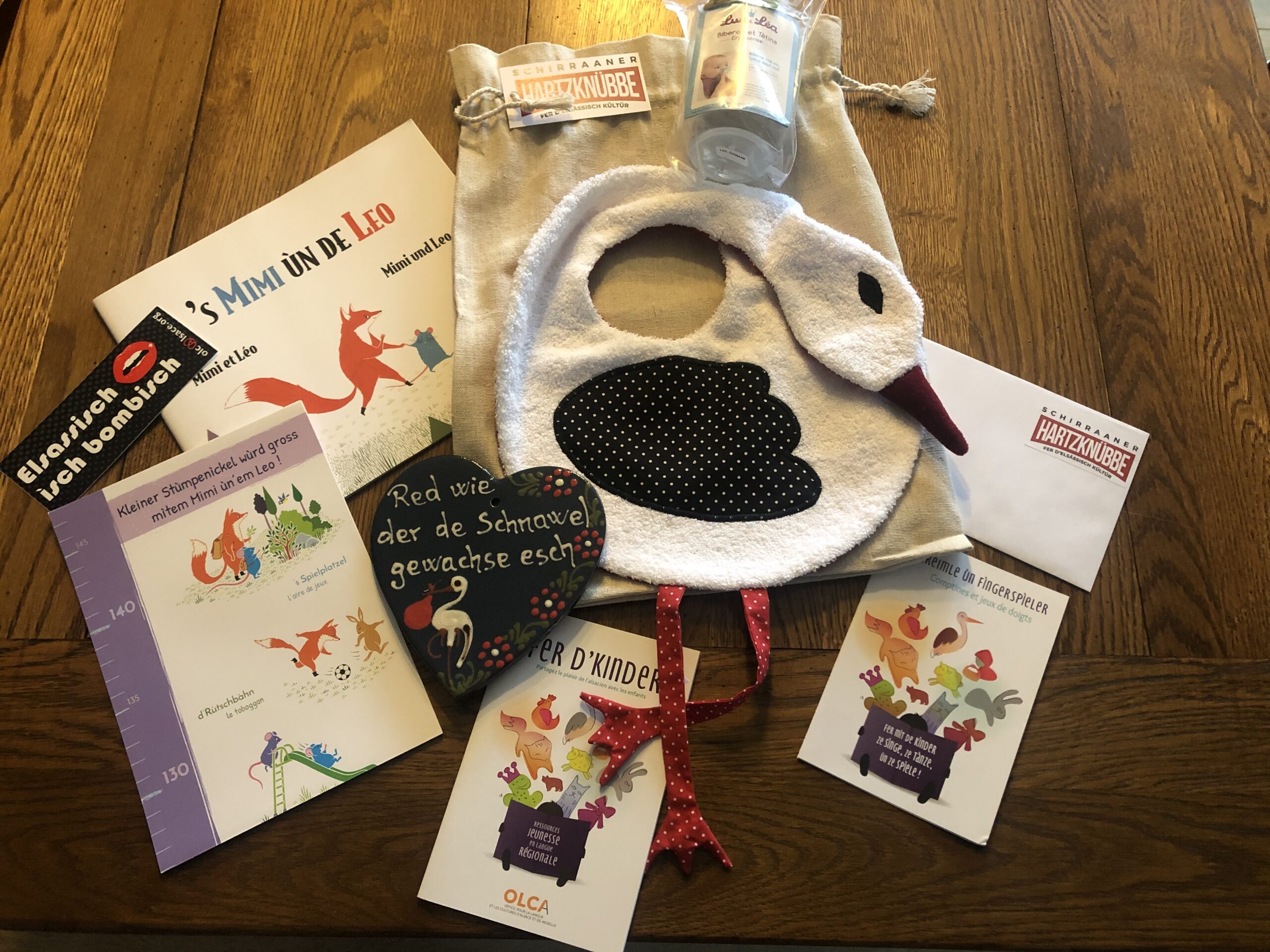 Récemment, pensant qu’il n’est jamais trop tôt pour apprendre le dialecte, ils ont eu l’idée d’offrir des pochettes de naissance aux jeunes parents de Schirrhein. Celles-ci contiennent des documents en alsacien provenant de l’OLCA, un biberon offert par la pharmacie de la commune, un cœur en poterie de Soufflenheim avec une inscription en dialecte, et un bavoir en forme de cigogne réalisé par une créatrice bas-rhinoise.
