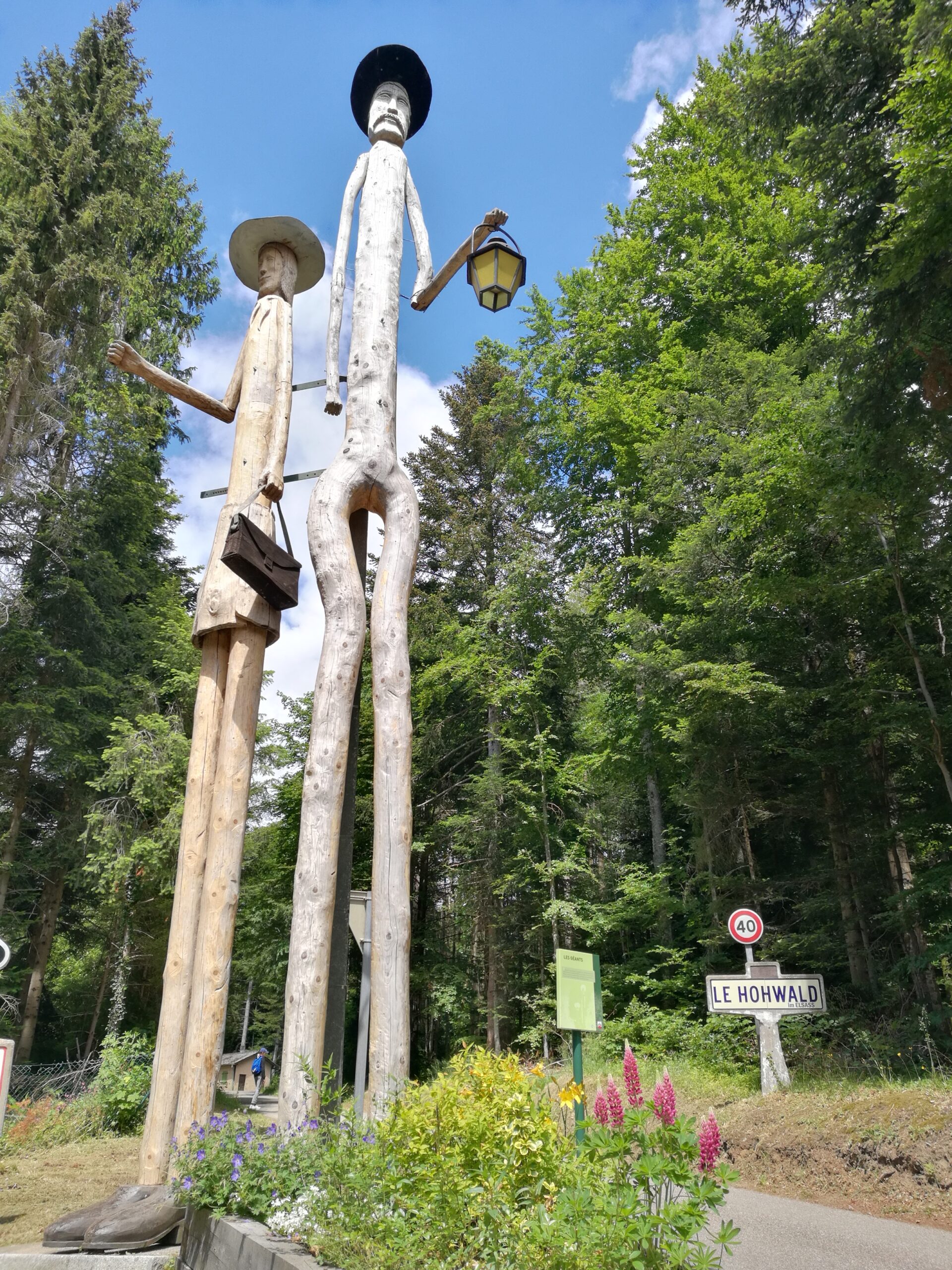 Deux géants, gardiens de la forêt, accueillent les visiteurs à l’entrée du camping de la commune Le Hohwald, située à moins d’une heure de route de Haguenau, au pied du Champ du feu. Un sentier balisé “cascade” part sur la gauche d’une sculpture, appelée “L’esprit de la forêt” qui laisse libre cours à l’imagination… Commence alors une marche ombragée, sans difficulté, jalonnée de ruisseaux et de petits ponts de bois, égayée aussi d’énormes limaces noires et autres scolopendres par temps humide.