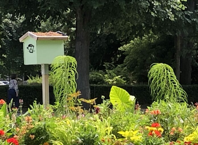 Au bout du monticule fleuri, une maisonnette verdit. On vient de l’installer pour les oiseaux ? Allons voir les merles ou les moineaux, et sous nos yeux ébahis, les ailes sont de papier ! C’est une boîte à livres ! On est curieux, on furète, mais c’est formidable, ce roman j’avais envie de le lire, je le prends sous ma garde. En repassant demain sous les fleurs, je remplirais la cage de quelques-uns des ouvrages qui dorment près de mon lit, petite chaîne d’amitié grâce aux livrets, aux albums, aux opuscules et aux spicilèges que l’on partagera avec bonheur.