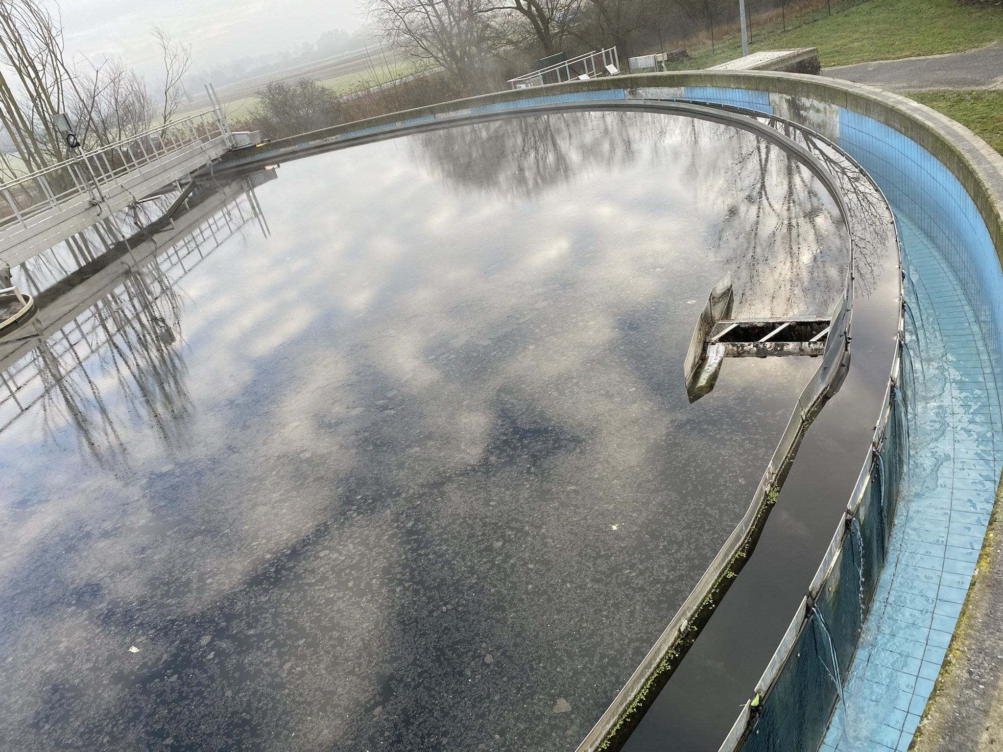 Le bassin clarificateur, où sont séparées bactéries, boues, et eau claire. ©SB